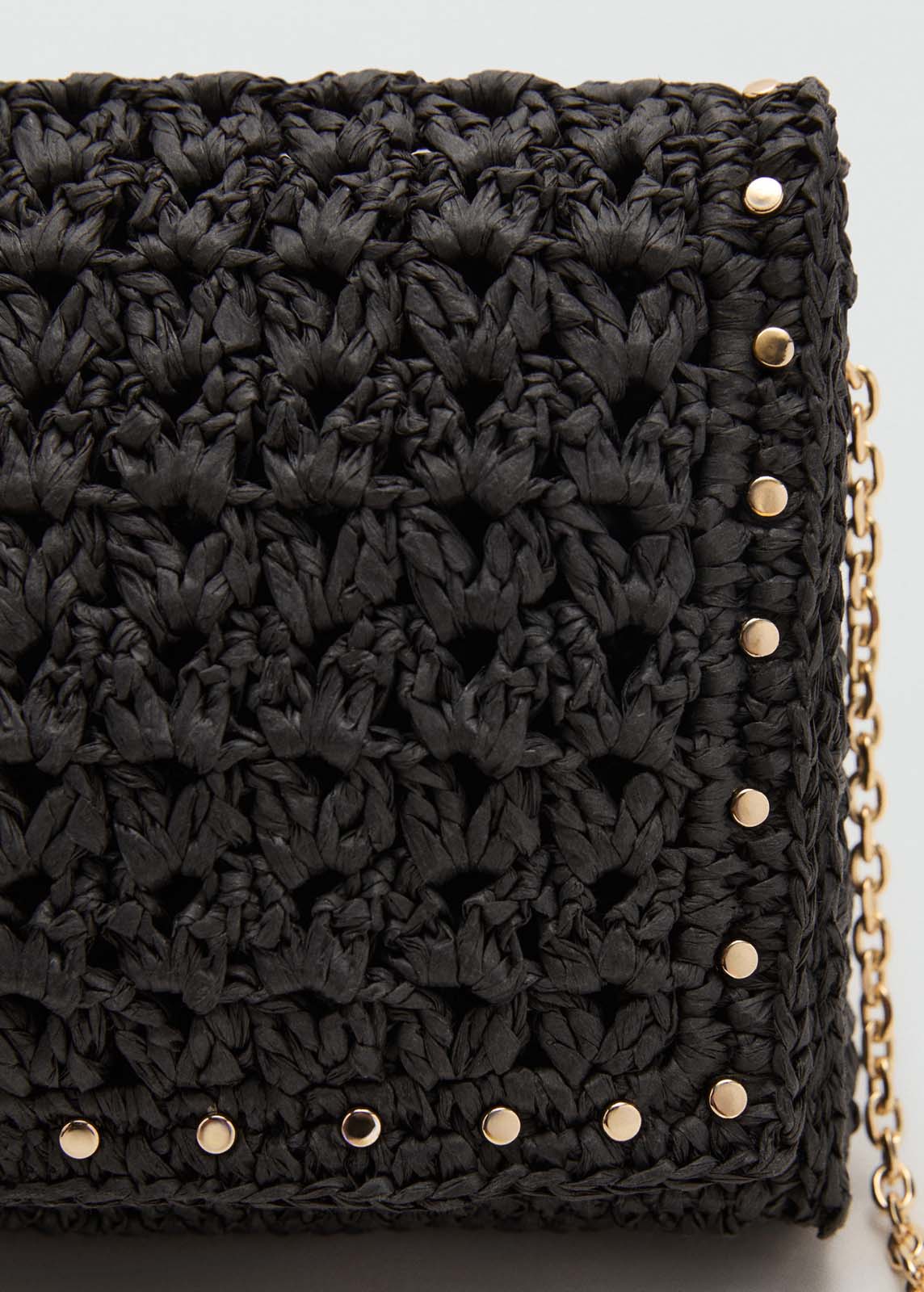 Tejido de fibra natural,Detalle de tachuelas,Bolsillo interior,Tamaño pequeño,Cierre de solapa con botón magnético,Asa larga de cadena,Forro interior