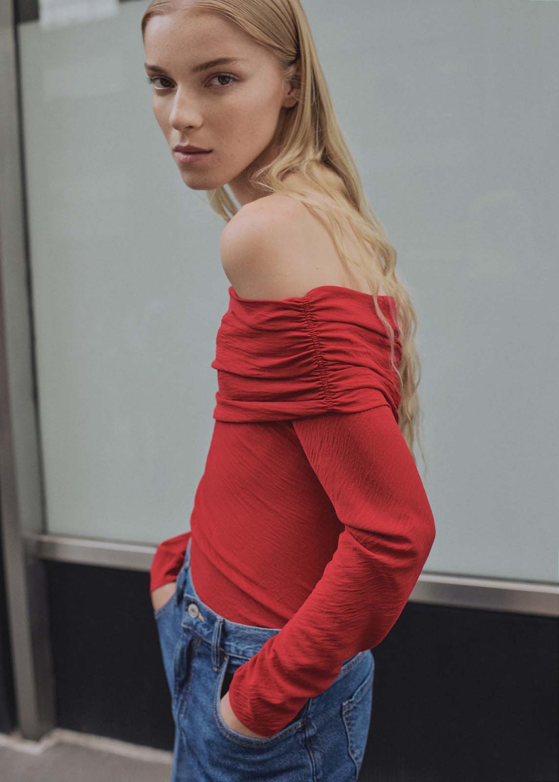 Tejido fluido,Hombros descubiertos,Diseño entallado,Manga larga