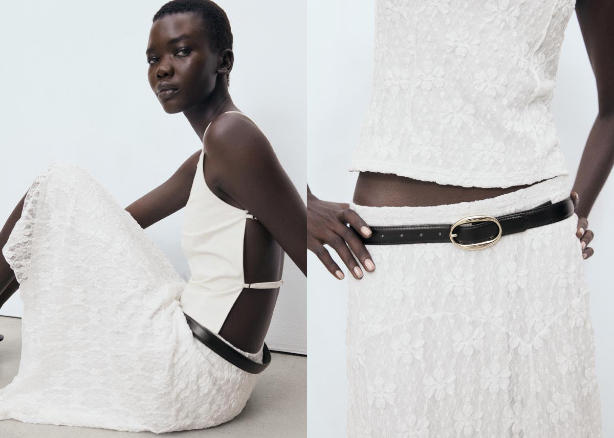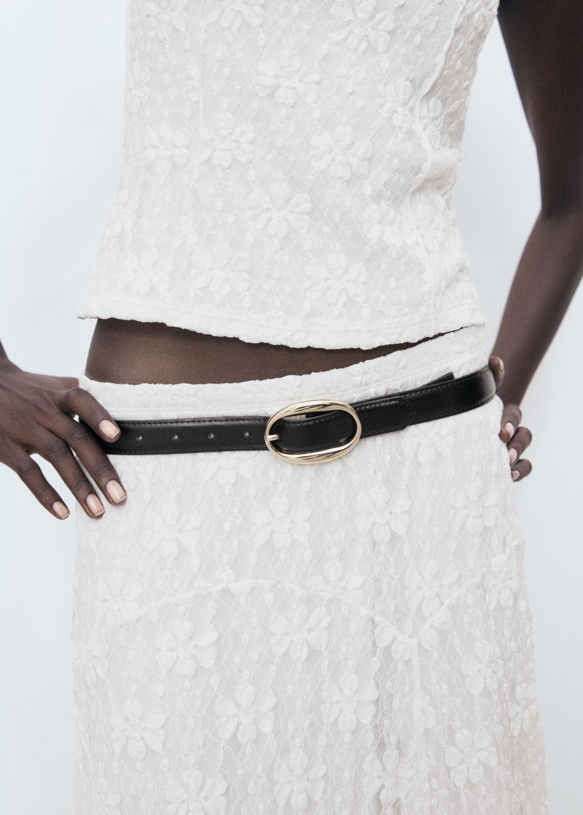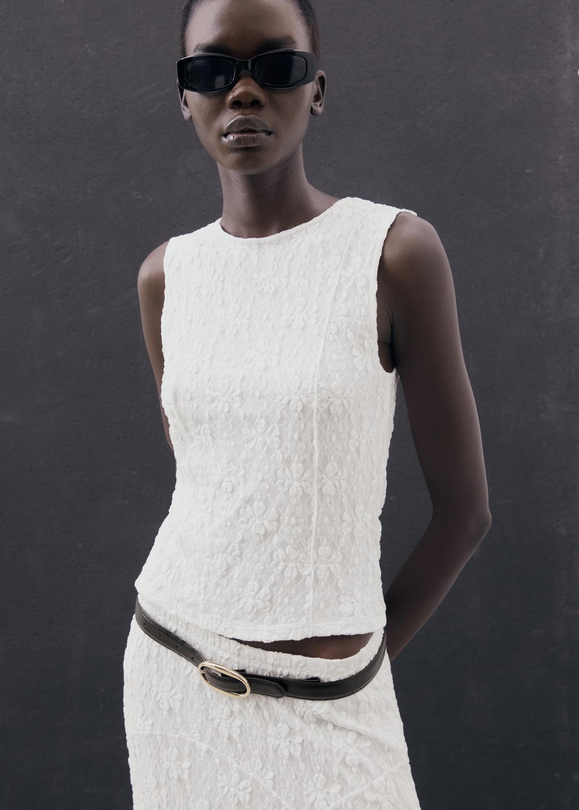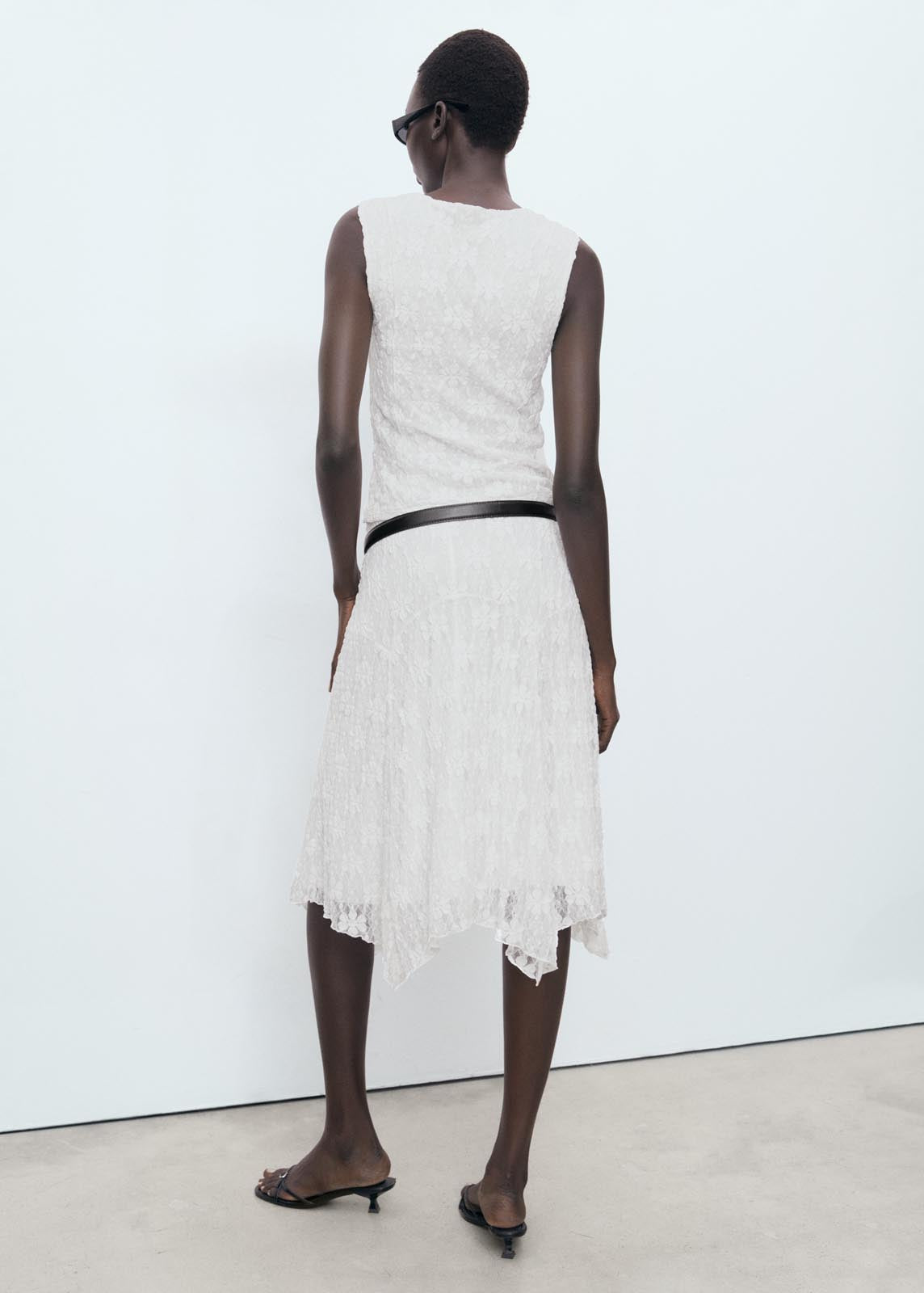 Cintura elástica,Tiro medio,Bajo con terminaciones en pico,Sin cierre,Tejido de encaje,Total look,Diseño recto,Diseño midi,Forro interior