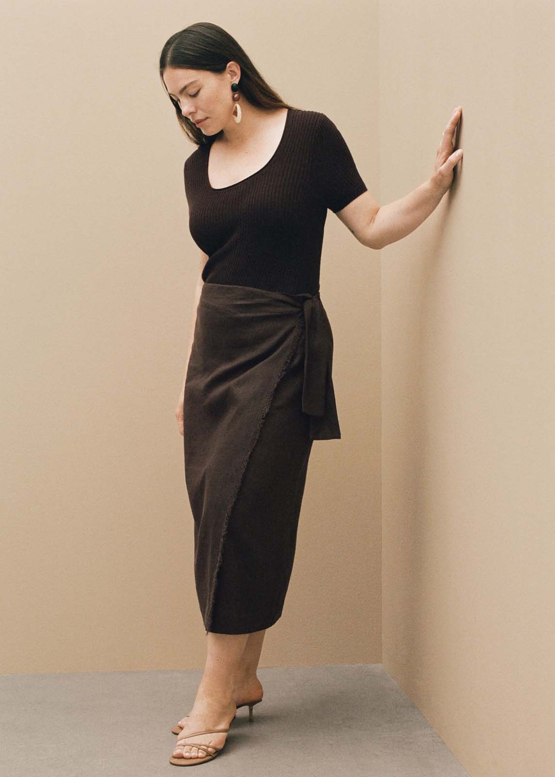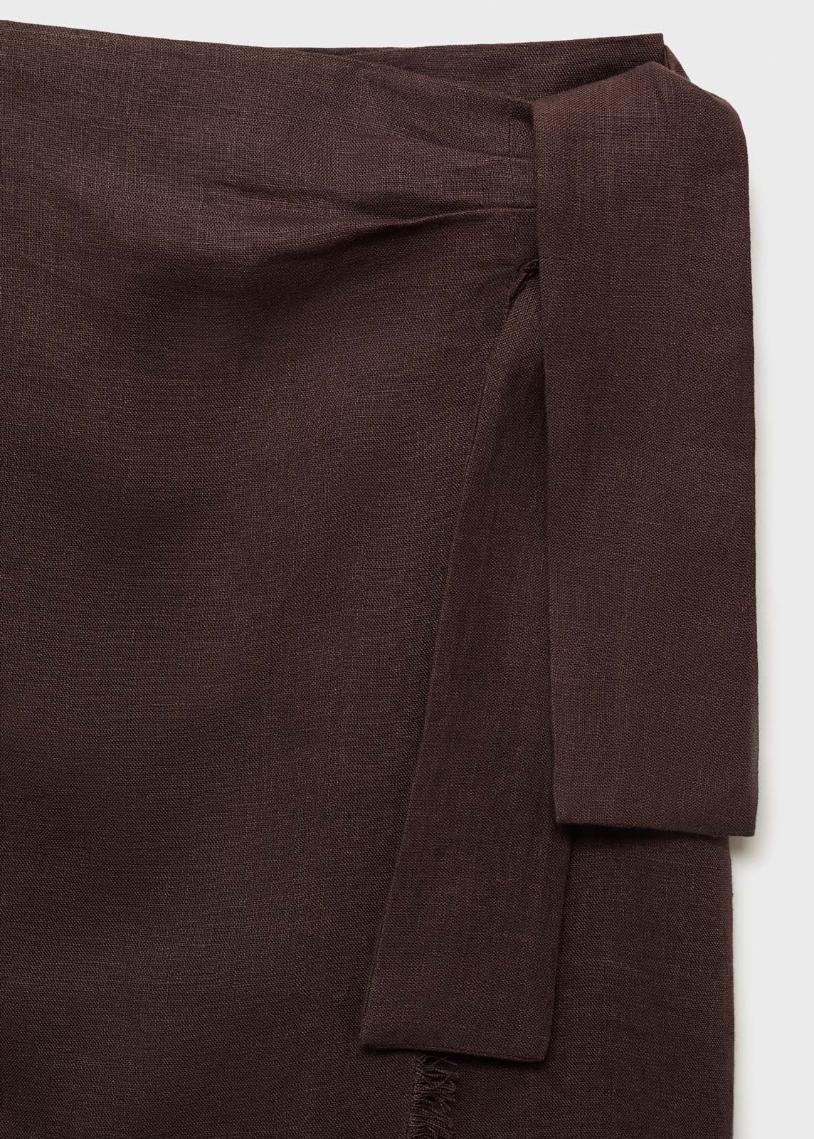 Detalle de nudo en la cintura,Tiro medio,Cierre delantero,Tejido 100% de lino,Disponible Plus,Diseño recto,Diseño midi