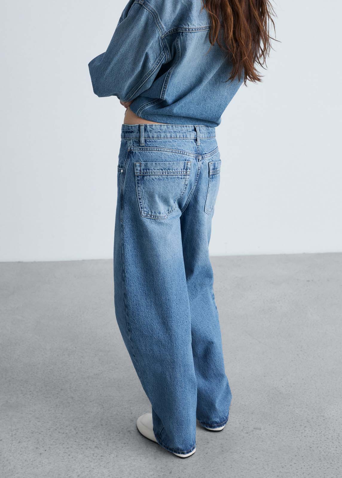 Largo interior 80,5 cm,Trabillas,Tiro medio,Cierre delantero de cremallera y botón,Cinco bolsillos,Diseño balloon,Fit slouchy,Tejido de algodón estilo tejano vaquero,Diseño largo