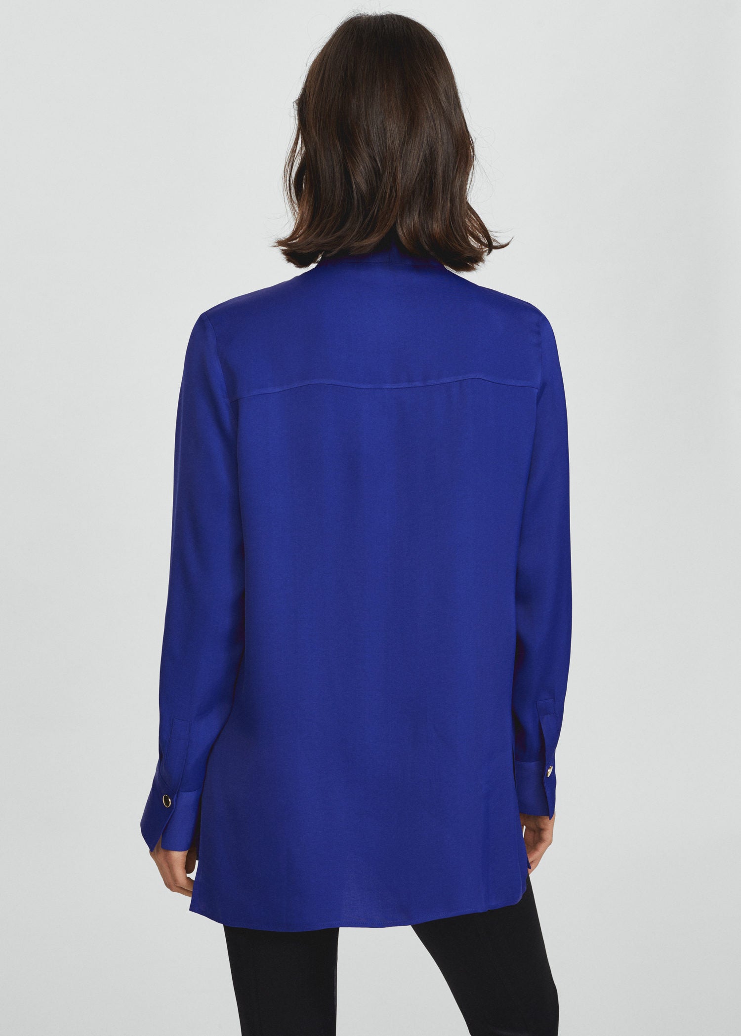 Cuello camisero,Tejido satinado,Tejido fluido,Manga larga con puños abotonados,Diseño largo,Cierre de lazo en el cuello,Cuello en forma de choker,Diseño recto,Colección fiesta y ceremonia,Cierre delantero con botones,Detalle de flor