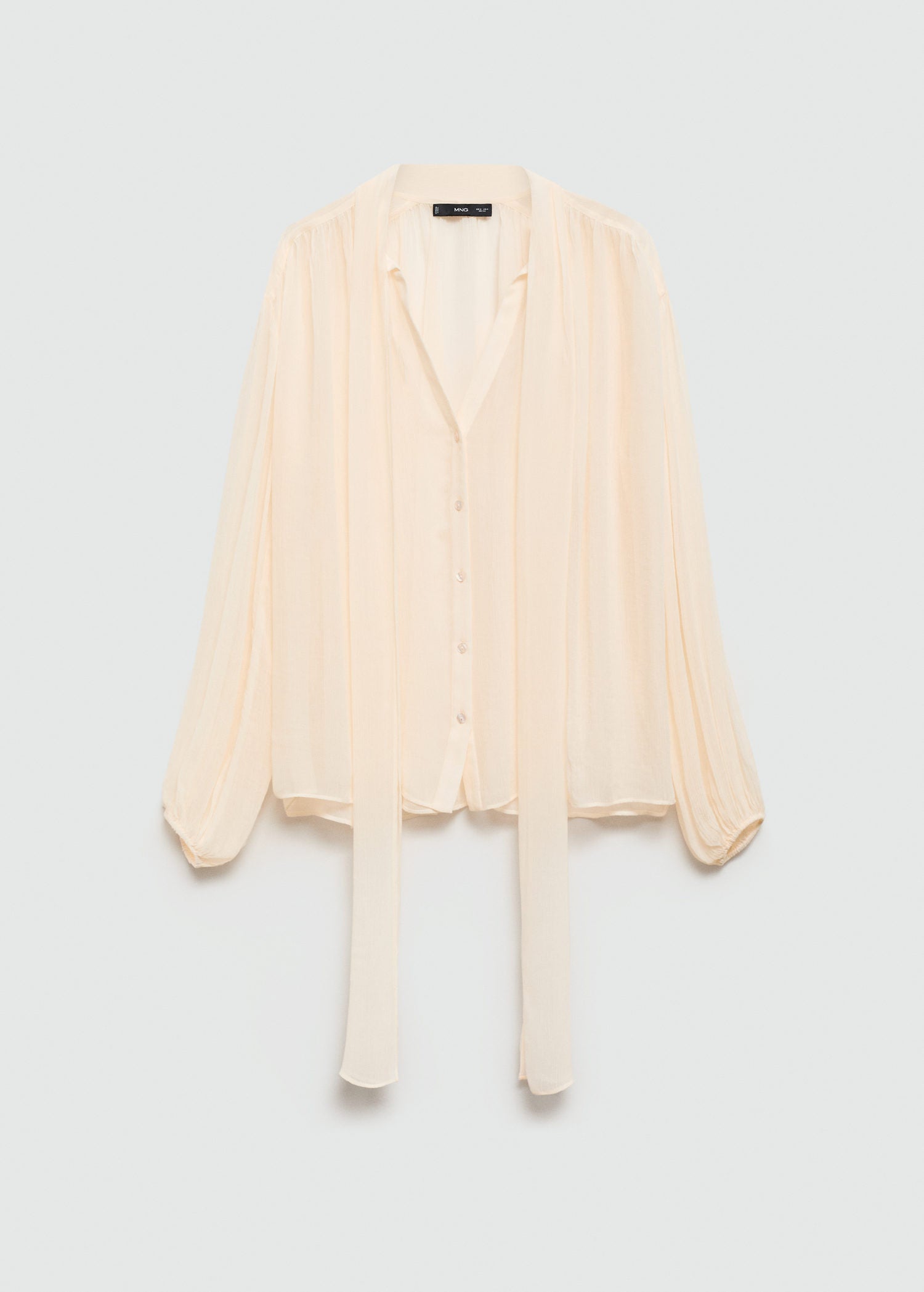 Tejido fluido,Tejido semitransparente,Lazada al cuello,Manga abullonada,Cierre delantero con botones,La modelo mide 1,77 y lleva una talla S/36,Manga larga