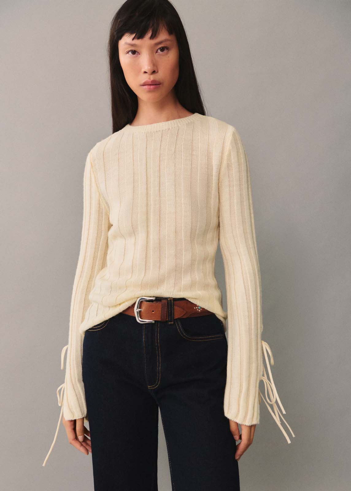 Diseño estándar,Tejido de canalé,Cuello redondo,Cierre de lazo en las mangas,La modelo mide 1,77 y lleva una talla S/36,Manga larga,Punto medio