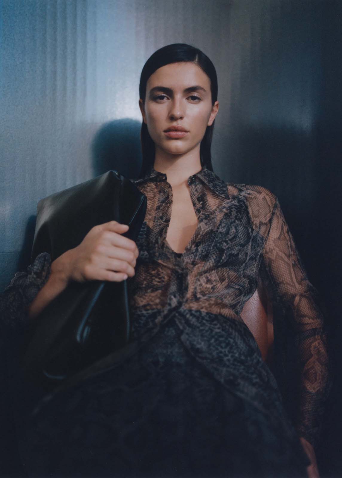 Estampado serpiente,Dos bolsillos de parche en la parte delantera,Cierre de botones en la parte delantera,Tejido semitransparente,Total look,Diseño recto,Cuello camisero,Tejido de organza,Manga larga abotonada,La modelo mide 1,78 y lleva una talla S/36