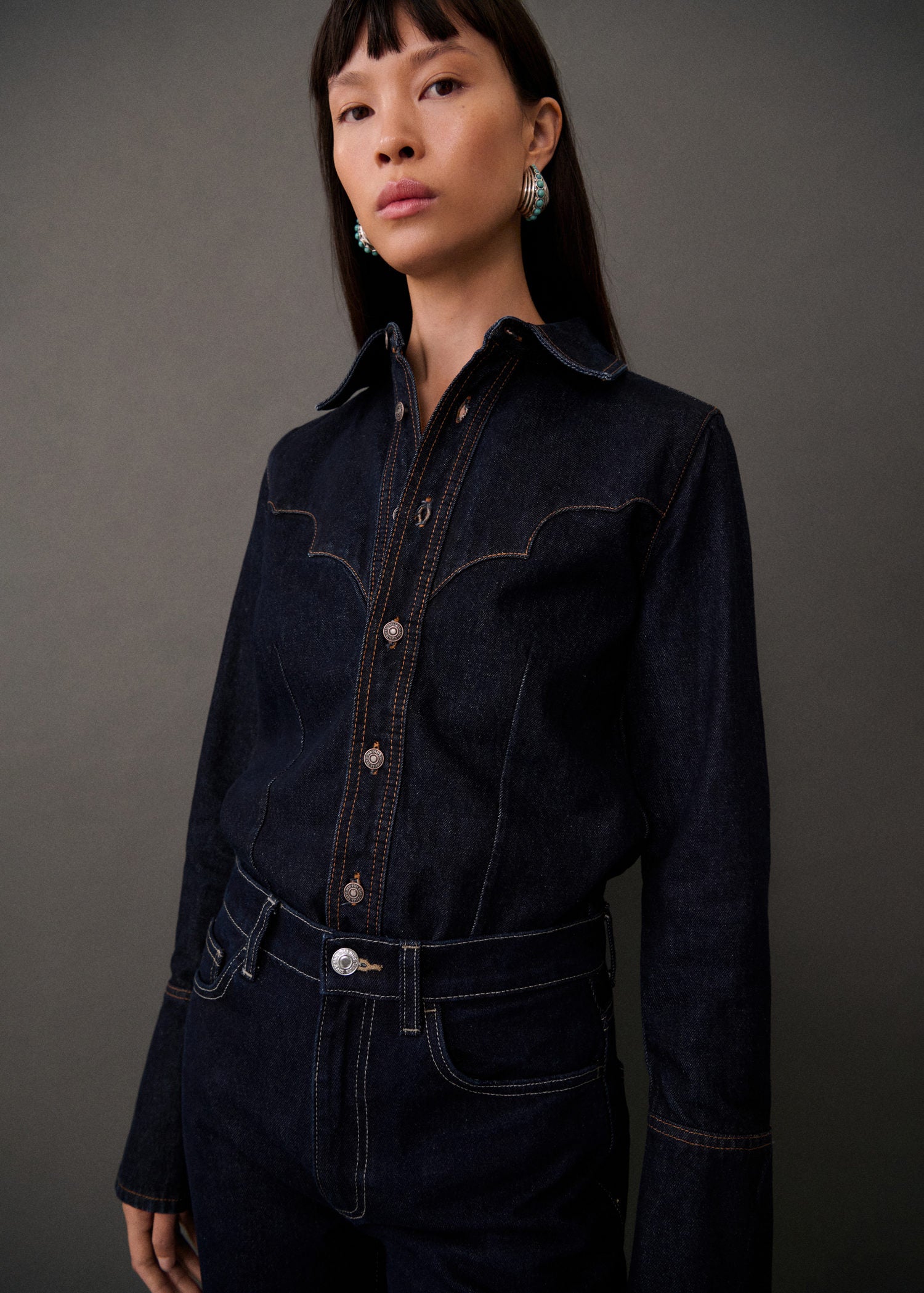 Total look,Manga larga con puños abotonados,Diseño recto,Cuello camisero,Costuras decorativas,Tejido de algodón estilo tejano vaquero,Cierre delantero con botones