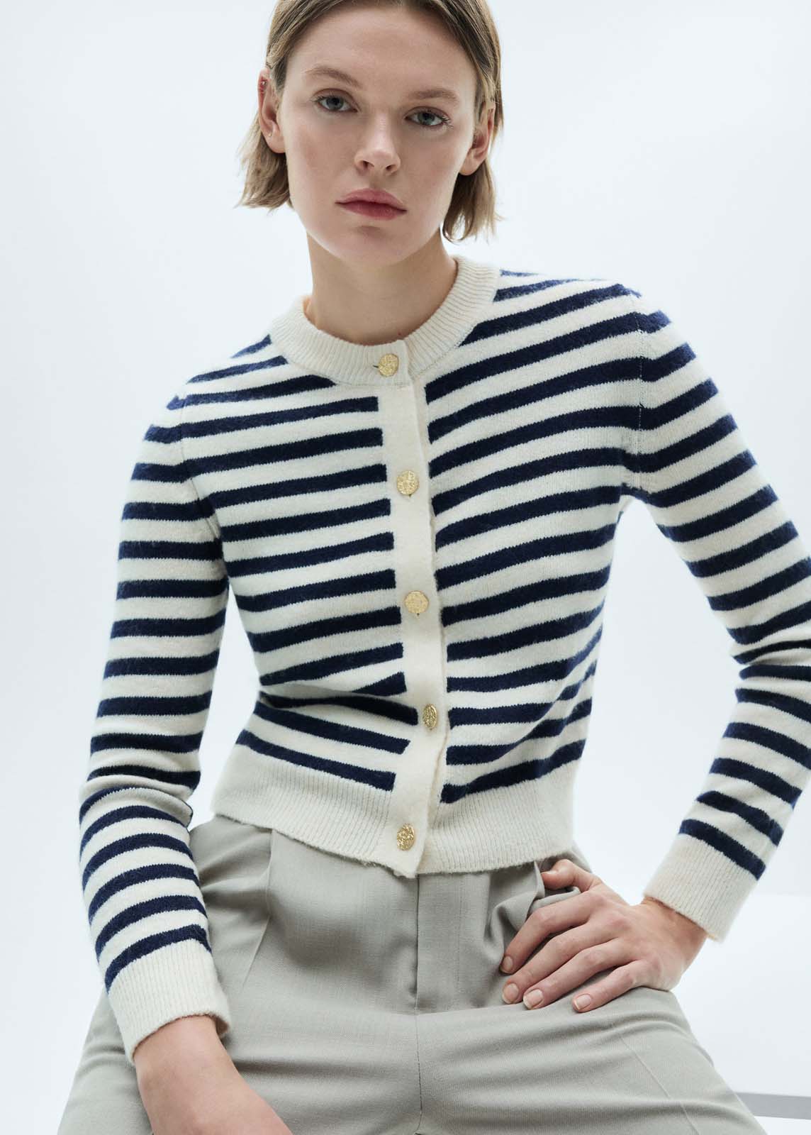 Botones efecto joya,Tejido de punto,Cuello redondo,Diseño recto,Diseño de rayas,Cierre delantero con botones,La modelo mide 1,79 y lleva una talla S/36,La modelo mide 1,80 y lleva una talla S/36,Manga larga