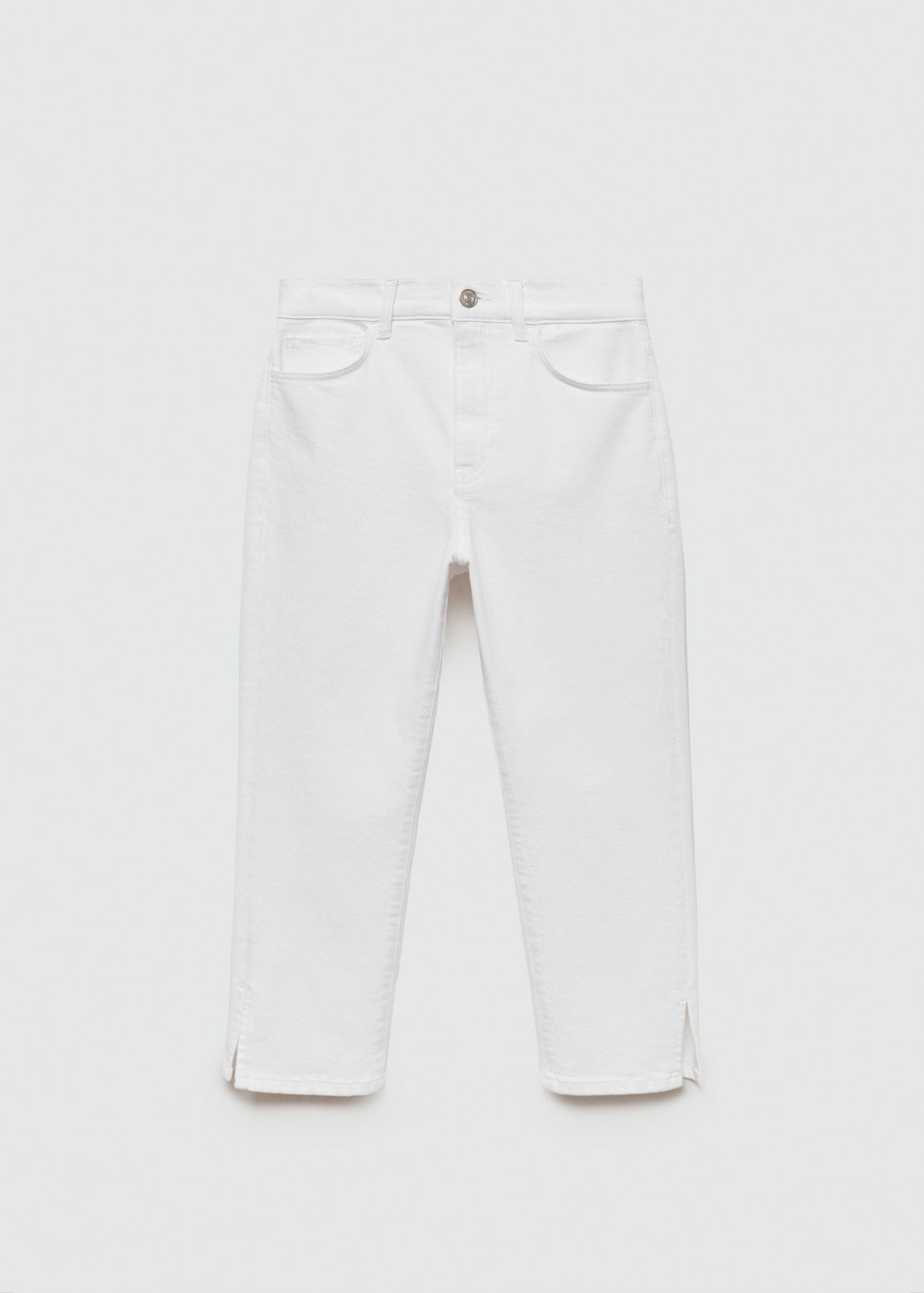 Cierre de cremallera y botón,Trabillas,Tiro medio,Cinco bolsillos,Tejido de algodón estilo tejano vaquero,Diseño capri,Bajo con aberturas laterales