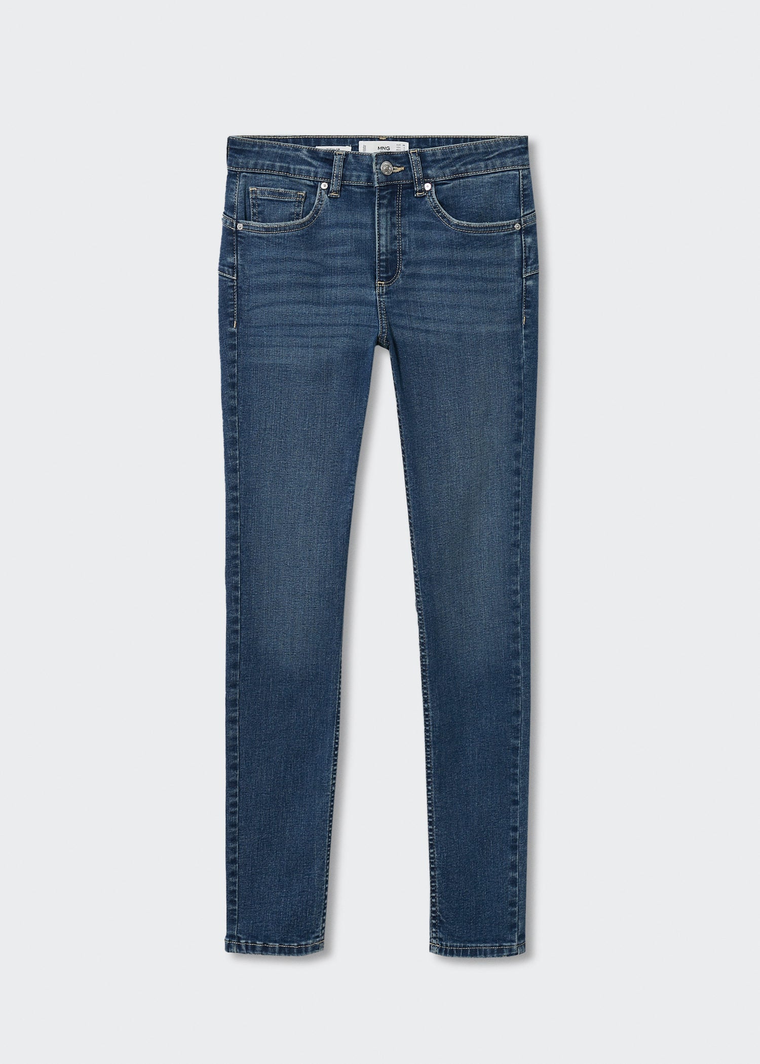 Tejido de algodón estilo tejano vaquero. Tejido mezcla de algodón. Tejido elástico. Diseño largo. Corte skinny. Tiro bajo. Cinco bolsillos. Trabillas. Cierre de cremallera y botón. Largo interior 74 cm. Disponible Plus. - COMPOSICIÓN: 85% algodón,13% poliéster,2% elastano