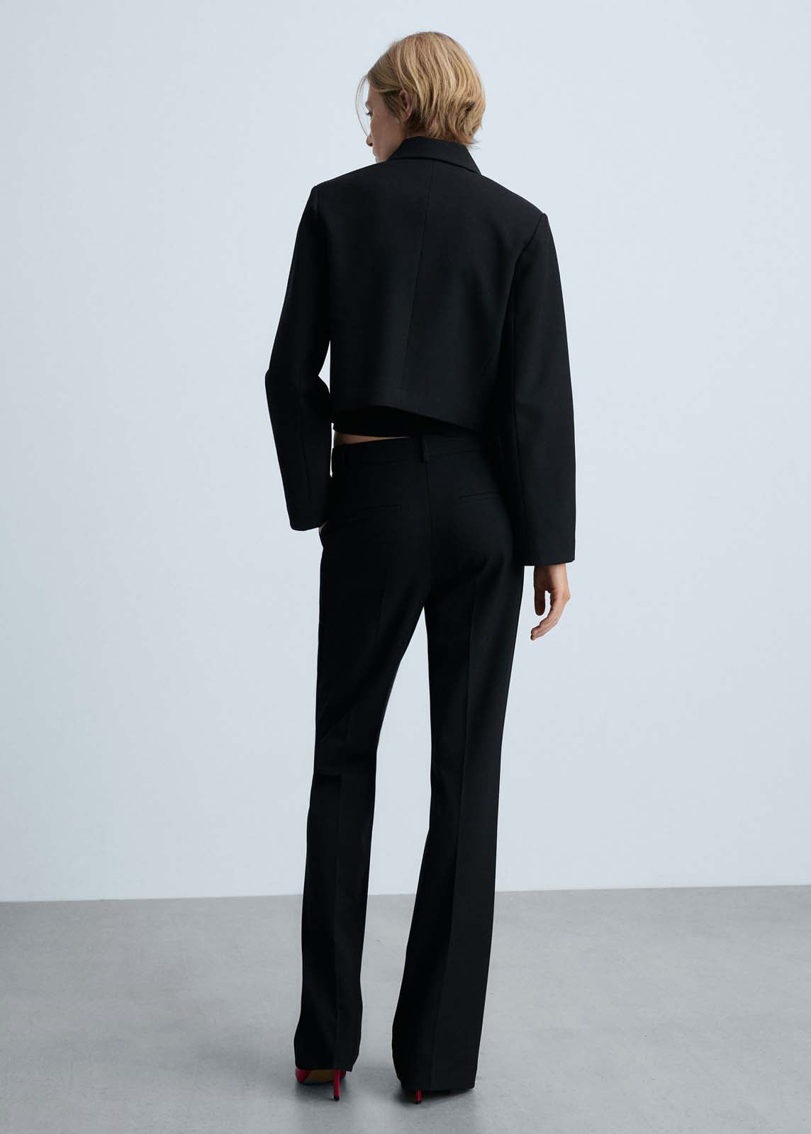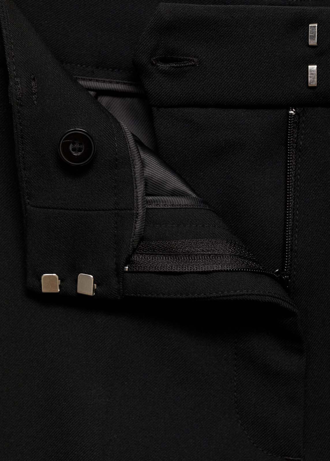 Diseño acampanado. Tiro alto. Estilo traje. Trabillas. Bolsillos laterales. Cierre oculto de botón, gancho y cremallera. Costuras decorativas.