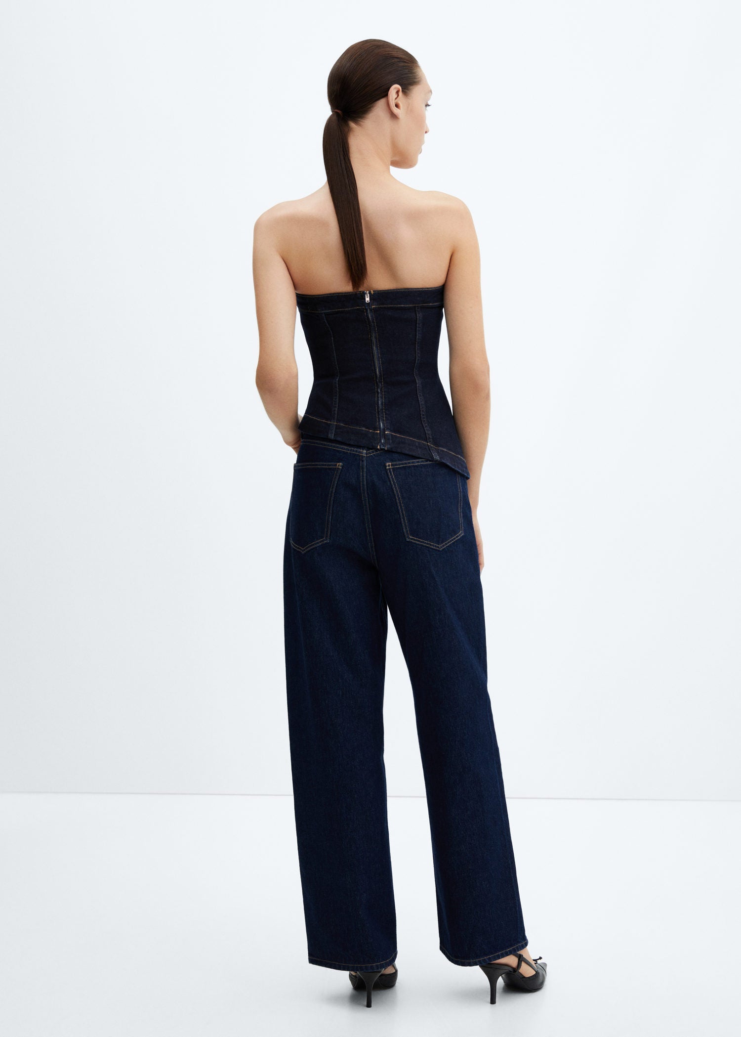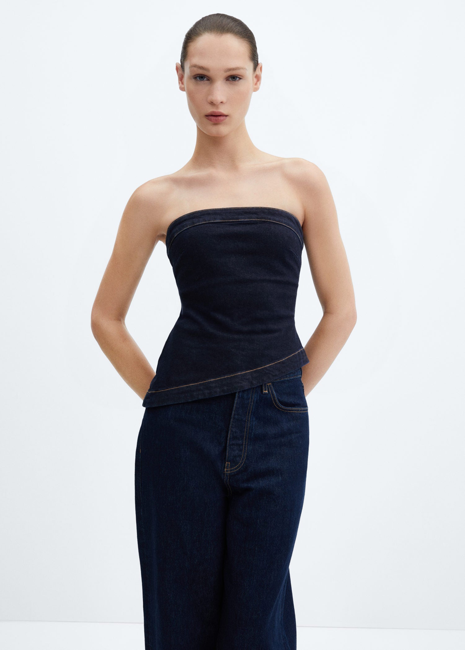 Tejido de algodón estilo tejano vaquero,Diseño entallado,Cierre de cremallera en la parte posterior,Diseño asimétrico,Palabra de honor,Sin mangas,Total look