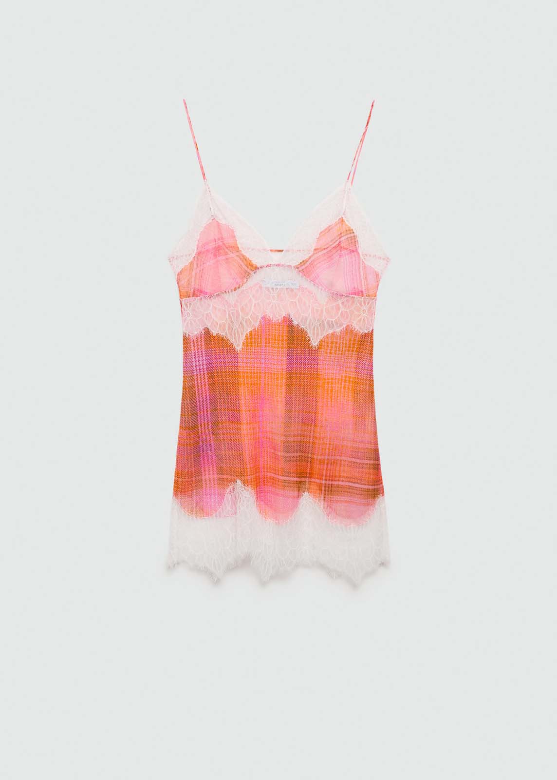 Terminaciones de encaje,Estampado de cuadros,Tejido fluido,Tirantes finos,Tejido semitransparente,Escote de pico,Diseño recto,Diseño largo,Sin mangas