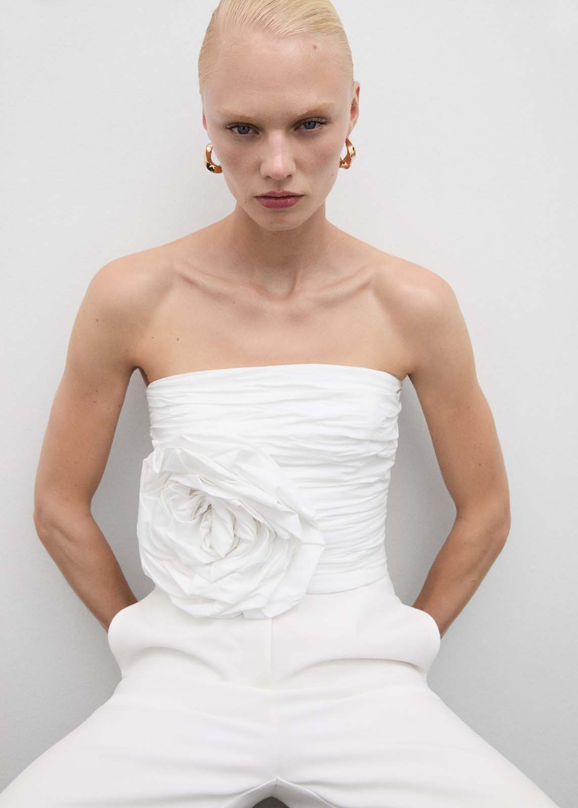 Colección fiesta y ceremonia,Espalda fruncida,Diseño crop,Palabra de honor,Tejido fruncido,Cierre de cremallera en la parte posterior,Maxi flor,Tejido de algodón,Sin mangas,Diseño entallado