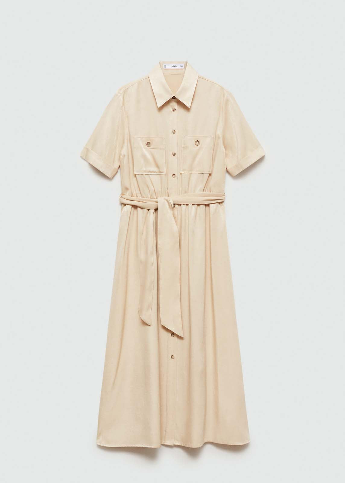 Trabillas,Manga corta,Tejido fluido,Dos bolsillos de parche en el pecho,Tejido satinado,Lazo ajustable en la cintura,Diseño recto,Cuello camisero,Diseño midi,Cierre delantero con botones