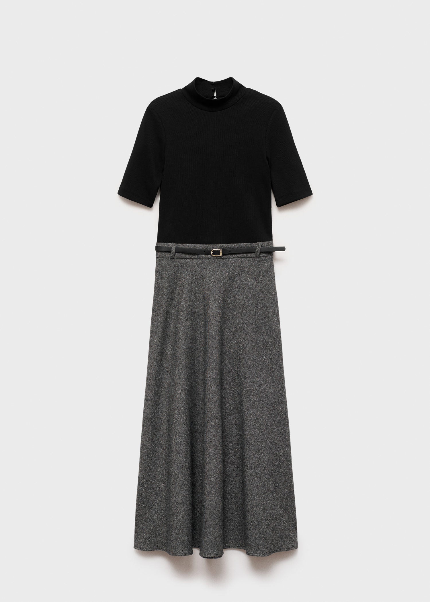 Trabillas,Manga corta,Cinturón decorativo,Cierre de botones en el cuello,Diseño evasé,Cierre de botones en la parte posterior,Tejido jaspeado,Cuello alto,Diseño midi,Tejido mezcla de algodón,Diseño combinado,Diseño entallado,La modelo mide 1,77 y lleva una talla S/36