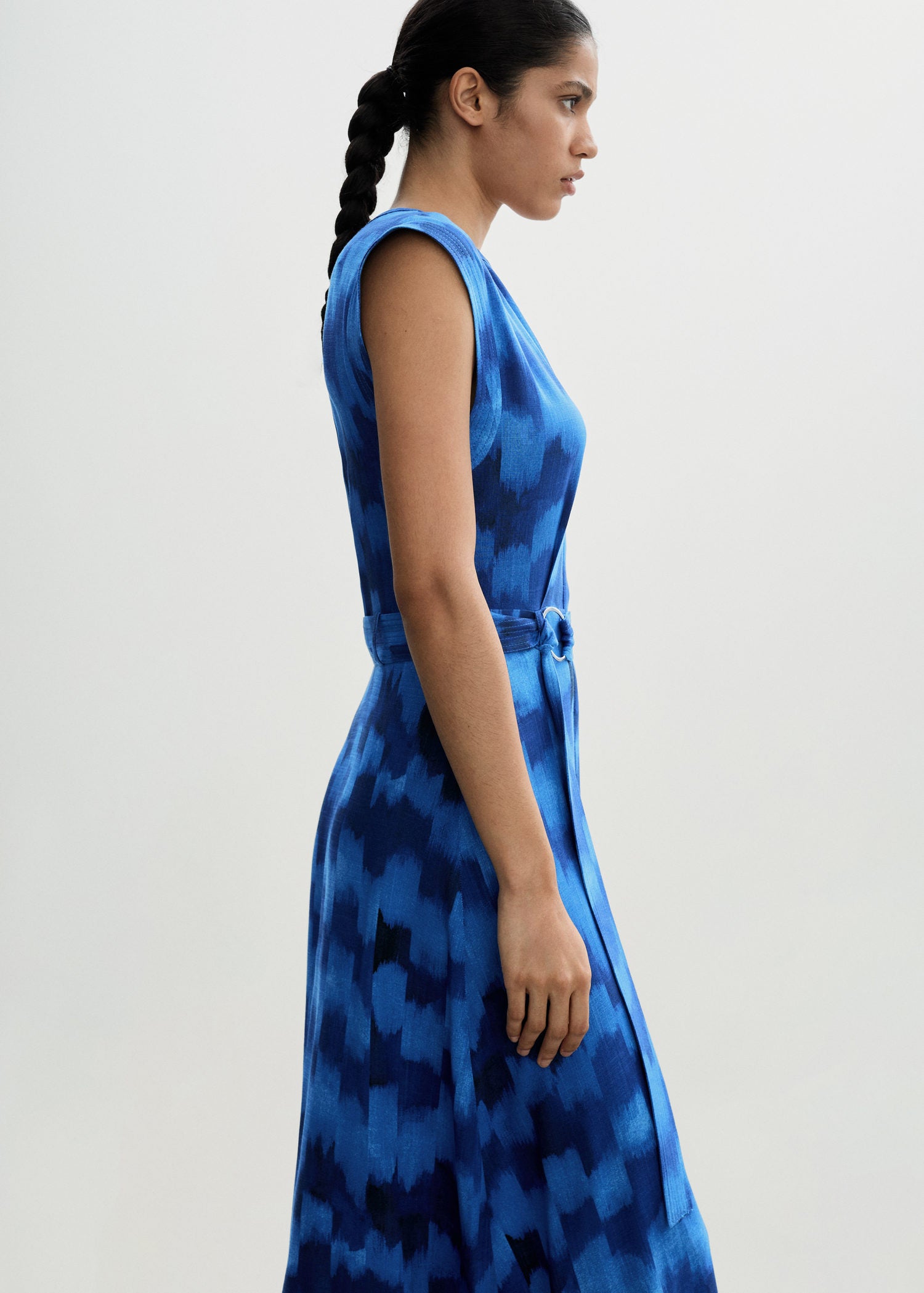 Cierre de botones oculto en la parte delantera,Trabillas,Tejido fluido,Cuello redondo,Diseño evasé,Cinturón ajustable,Disponible Plus,Diseño midi,Sin mangas,Diseño estampado