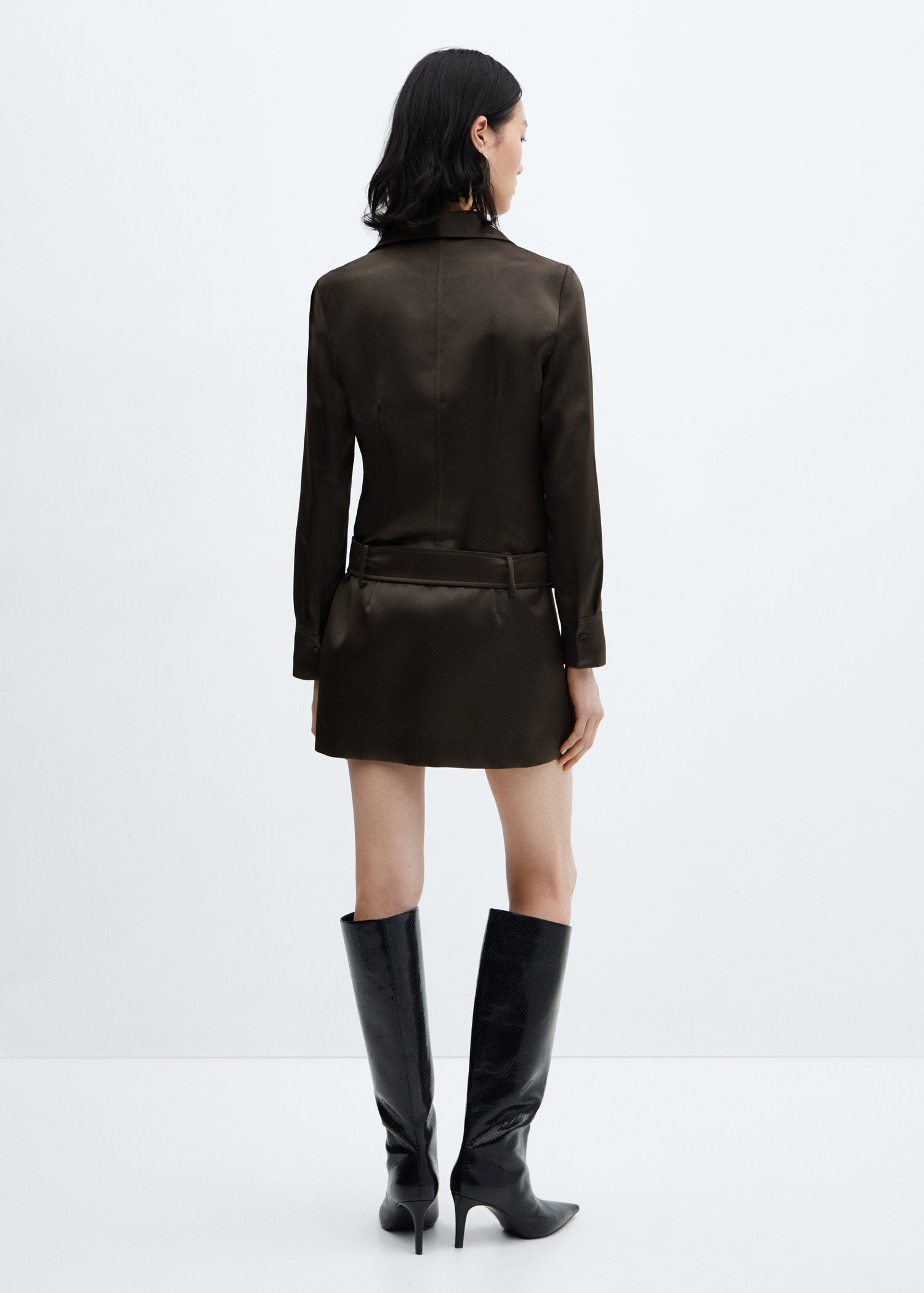 Cuello camisero,Tejido satinado,Tejido fluido,Manga larga con puños abotonados,Forro interior,Trabillas,Cinturón desmontable,Diseño recto,Diseño corto,Colección fiesta y ceremonia,Cierre cremallera invisible en el lateral,Cierre delantero con botones