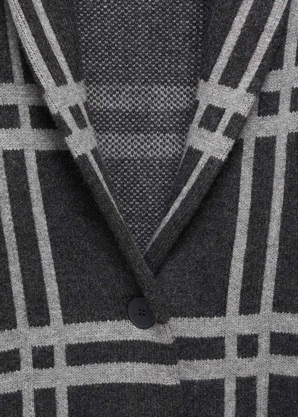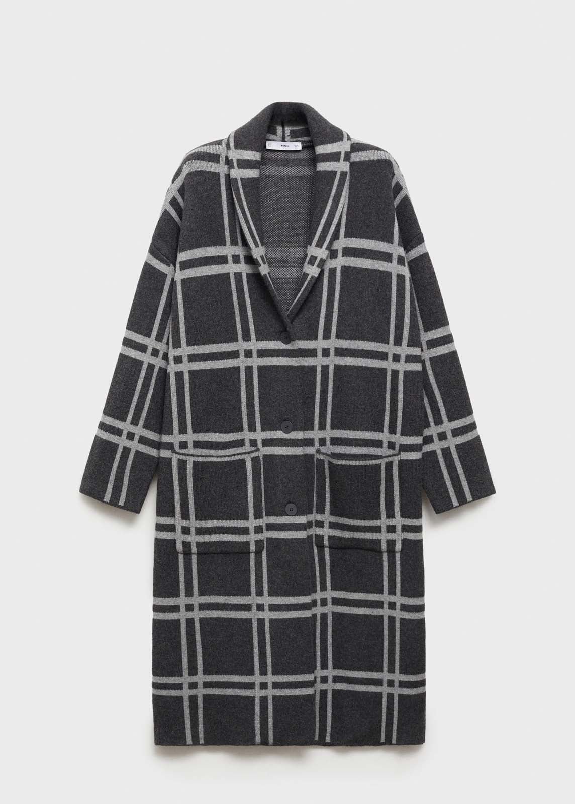 Cuello pico con solapa,Estampado de cuadros,Tejido de punto grueso,Dos bolsillos de parche en la parte delantera,Cierre de botones en la parte delantera,Diseño recto,Diseño midi,Manga larga
