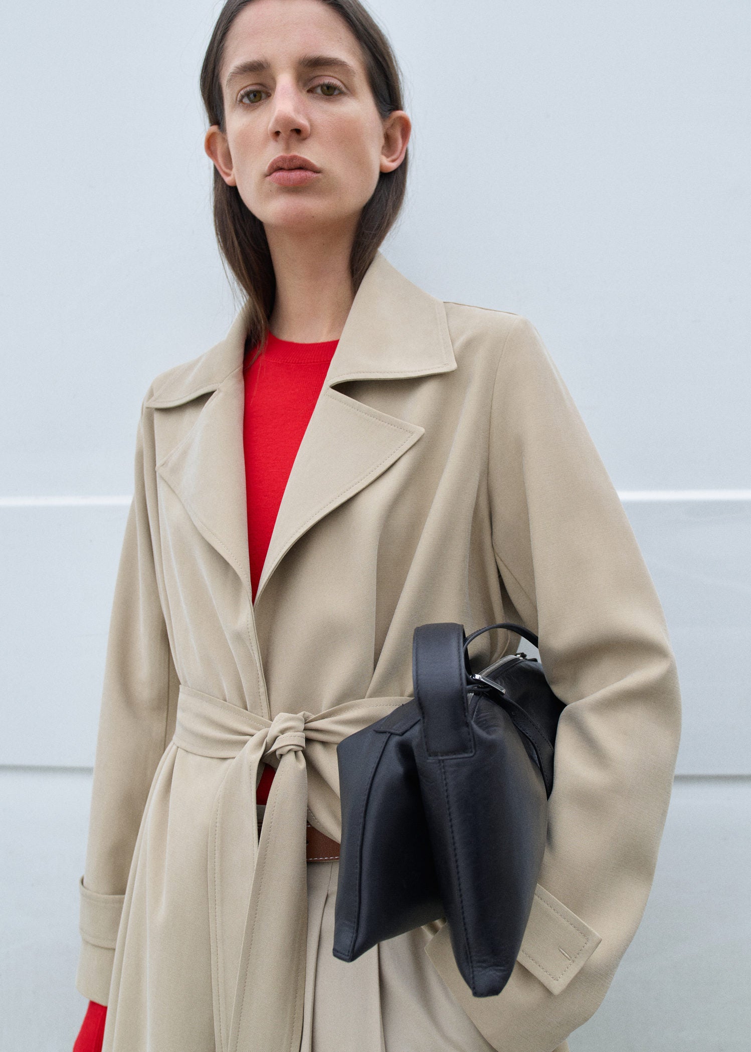 Diseño oversize,Tejido fluido,Trabillas,Dos bolsillos laterales,Cuello de solapa,Cinturón desmontable,Abertura posterior en el bajo,Manga larga con trabillas,Water Repellent: Tejido técnico repelente al agua,Diseño medio