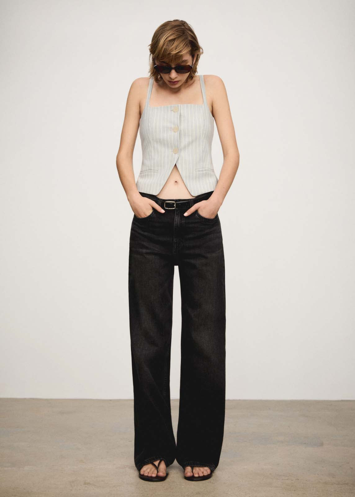 Forro interior,Dos bolsillos de ribete delanteros,Estampado de rayas,Tejido fluido,Tirantes finos,Total look,Diseño recto,Sin mangas,Escote cuadrado,Cierre delantero con botones