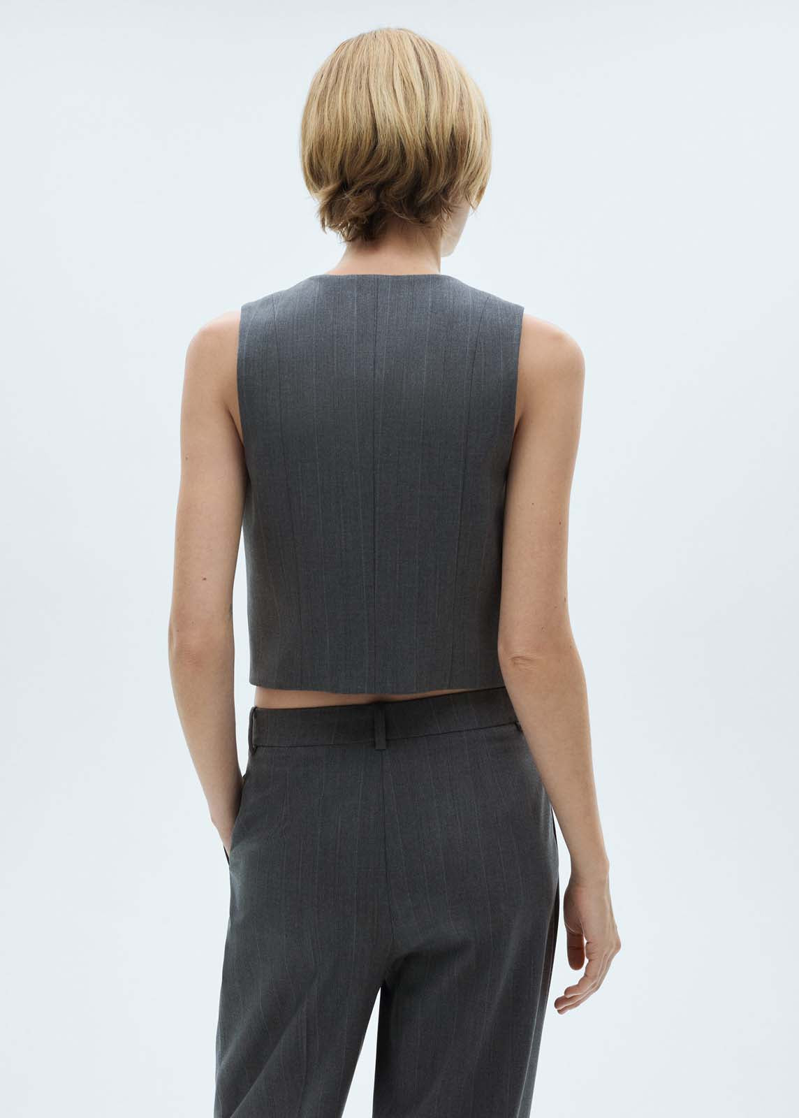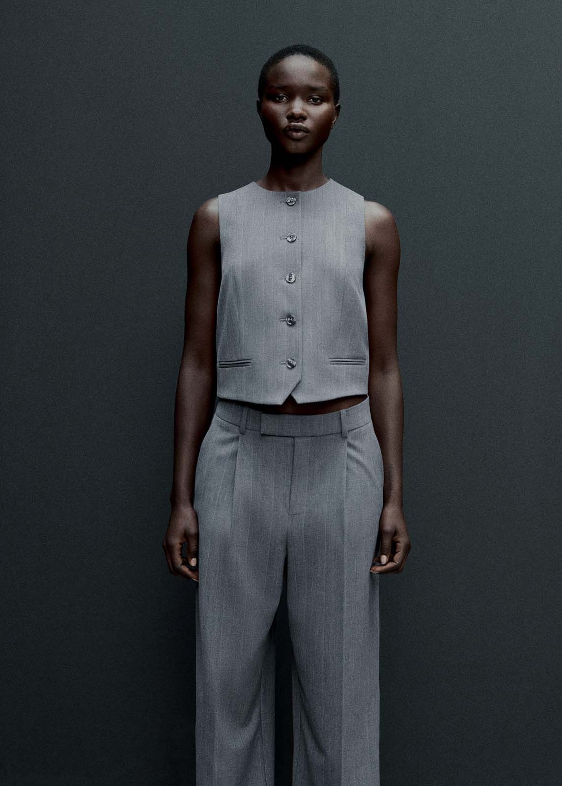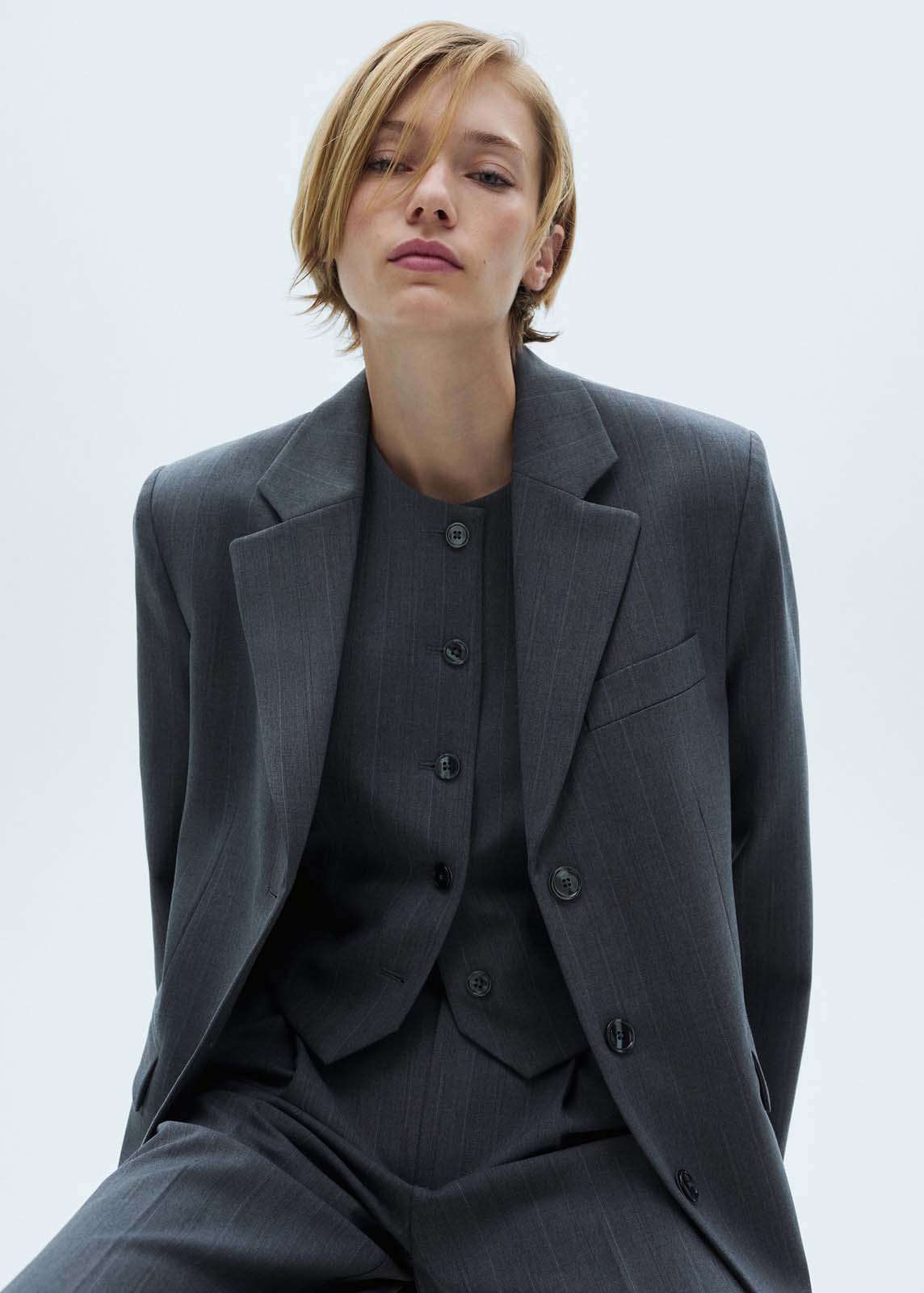 Forro interior,Cuello pico,Cierre de botones en la parte delantera,Estampado de raya diplomática,Disponible Plus,Total look,Diseño recto,Estilo traje,Sin mangas,La modelo mide 1,81 y lleva una talla S/36