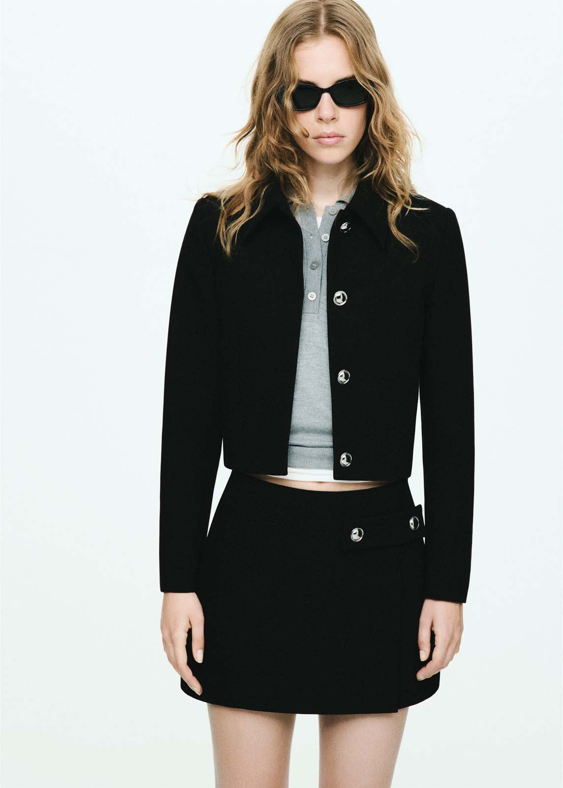 Forro interior,La modelo mide 180 cm y lleva una talla S,Diseño crop,Total look,Diseño recto,Cuello camisero,Cierre delantero con botones,Manga larga