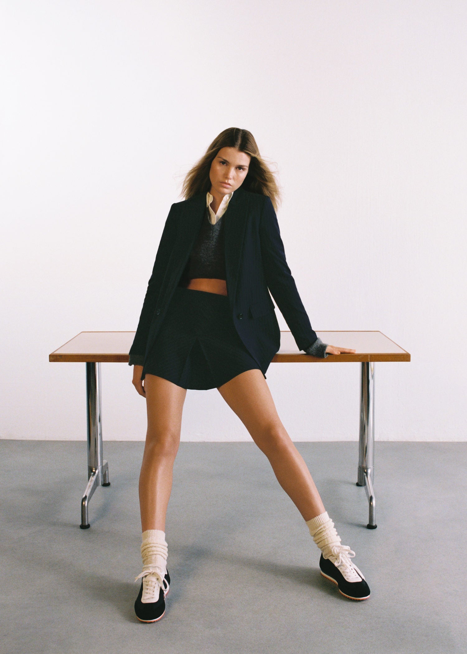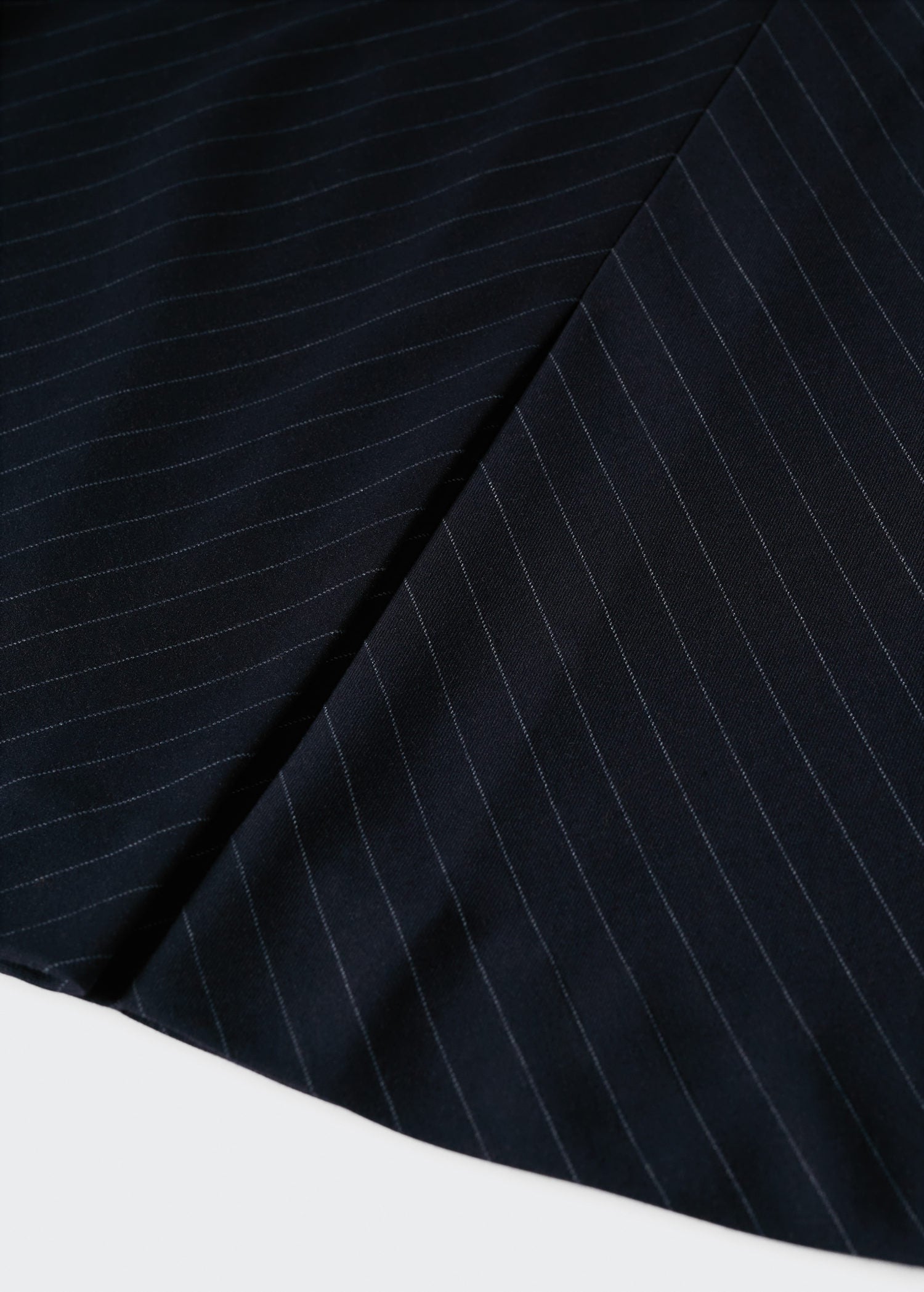 Estampado de raya diplomática. Diseño corto. Diseño entallado. Pliegue en la parte delantera. Cierre cremallera invisible en el lateral. Forro interior. Total look.