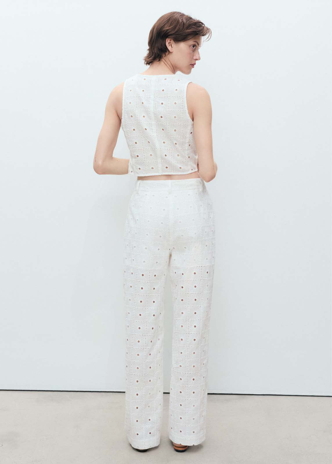 Cierre delantero de botón, gancho y cremallera ocultos con tapeta,Trabillas,Tiro medio,Dos bolsillos laterales,Total look,Bordado floral,Diseño recto,Detalles calados,Diseño largo,Tejido de algodón