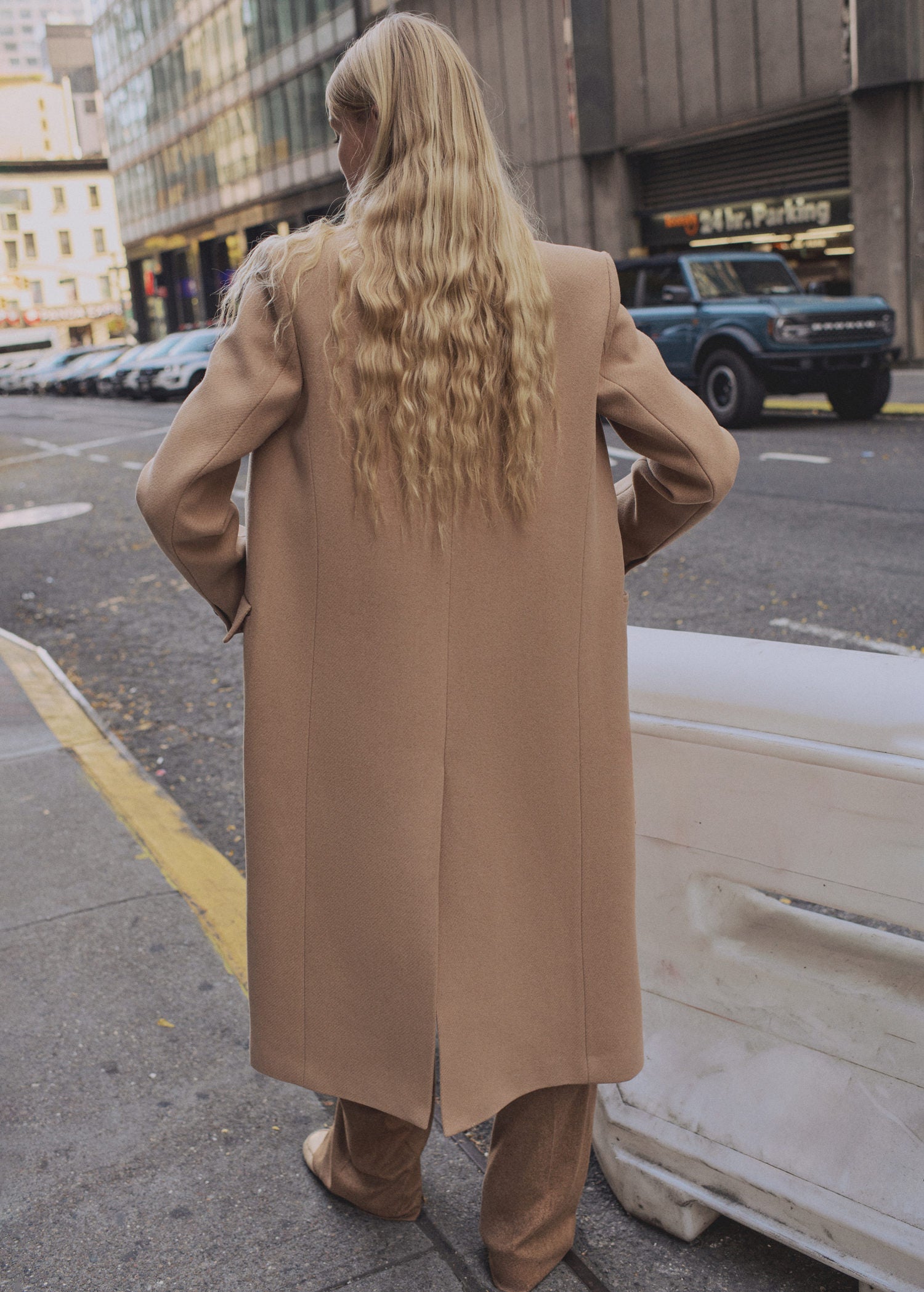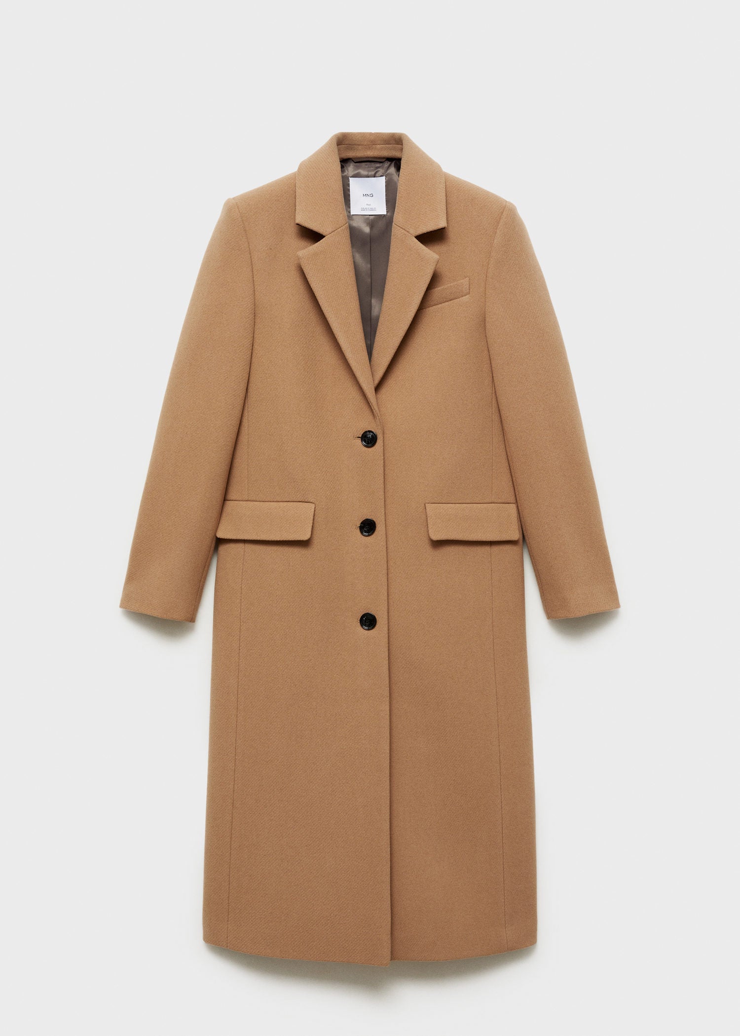 Forro interior,Abertura posterior en el bajo,Cuello pico con solapa,Tejido mezcla de lana,Cierre de doble botonadura,Solapas con muesca,Manga larga con puños abotonados,Diseño recto,Diseño largo,Un bolsillo de ribete en el pecho,Dos bolsillos de solapa en la parte frontal
