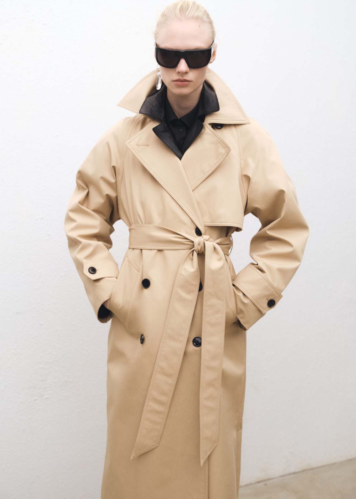 Cuello pico con solapa,Trabillas,Esta prenda pertenece a nuestra colección de evento, diseñada para convertirte en la invitada perfecta en cualquier fiesta, boda o ceremonia,Cierre de doble botonadura,Cuello abotonado,Colección Selection,Solapas con muesca,Dos bolsillos laterales,Manga larga con puños abotonados,Cinturón desmontable,Diseño oversize,Diseño largo,Tejido 100% algodón,Forro interior