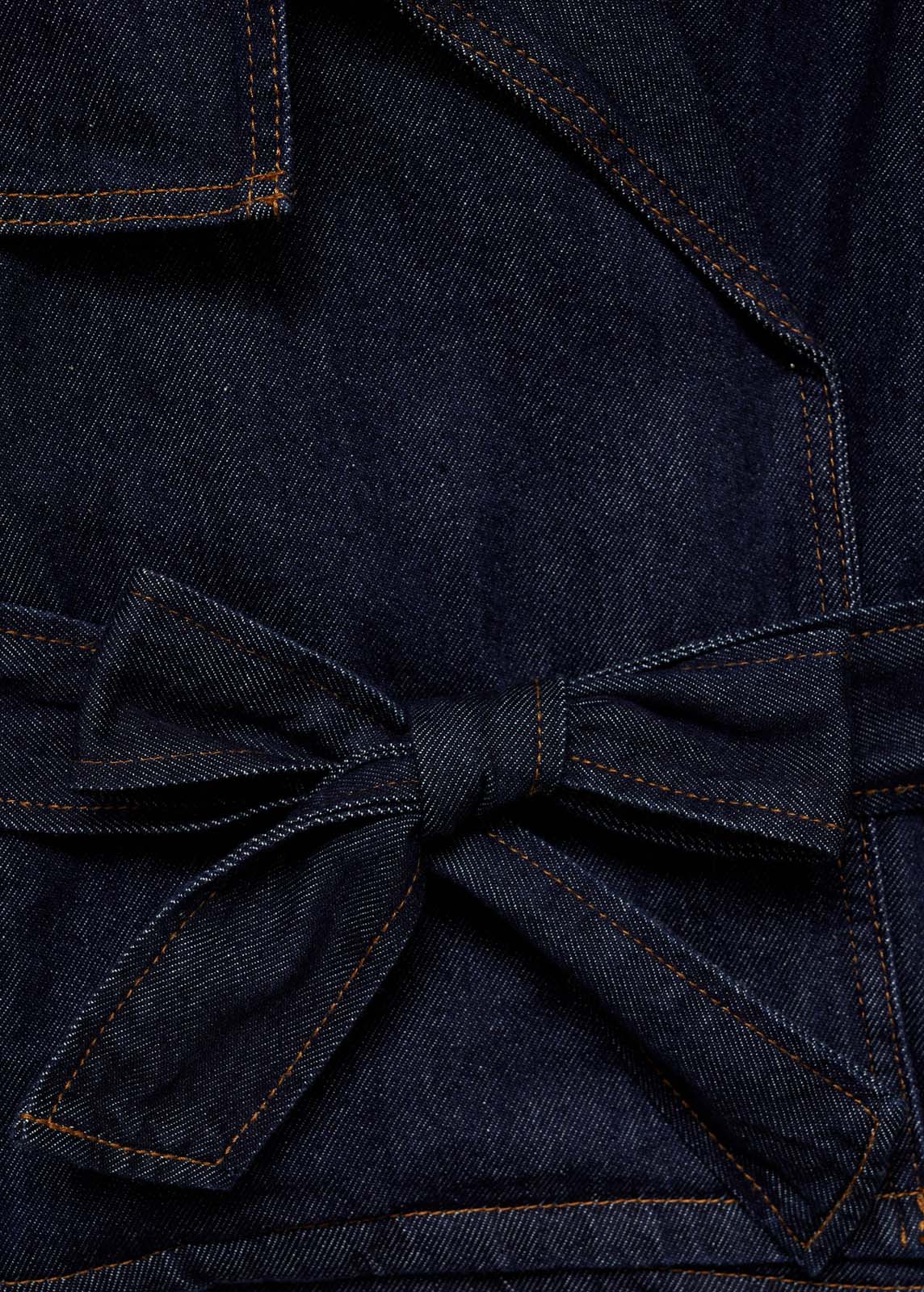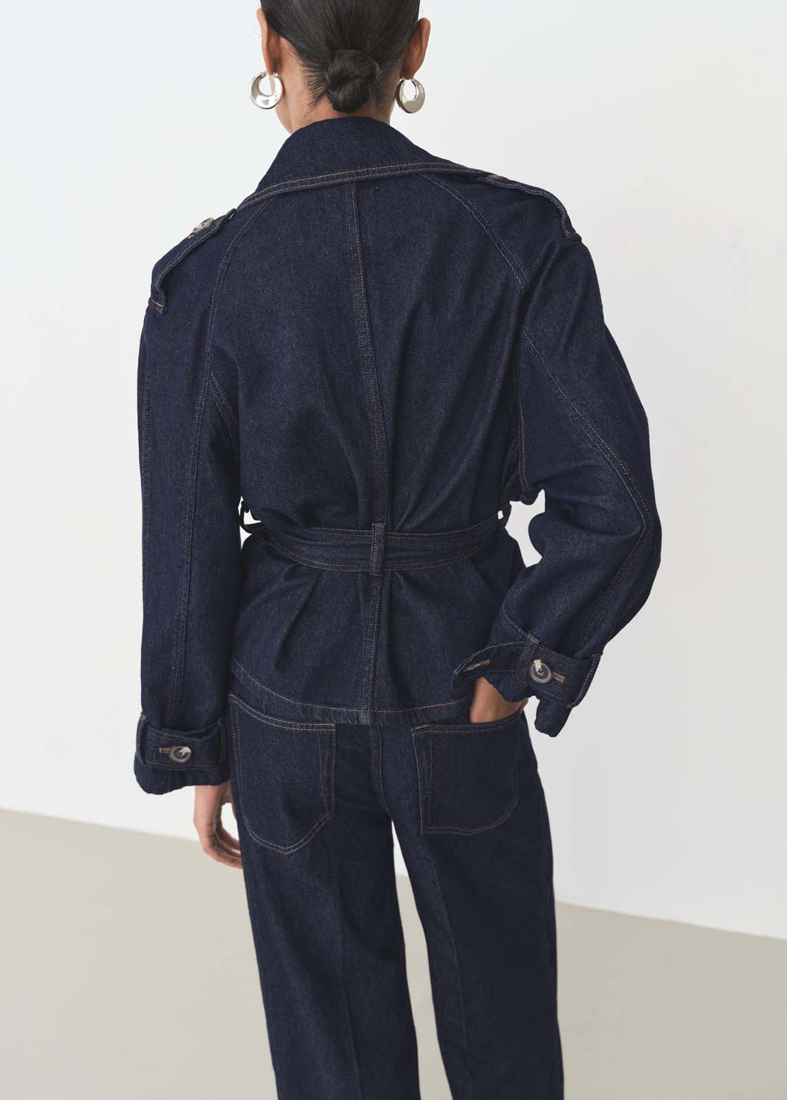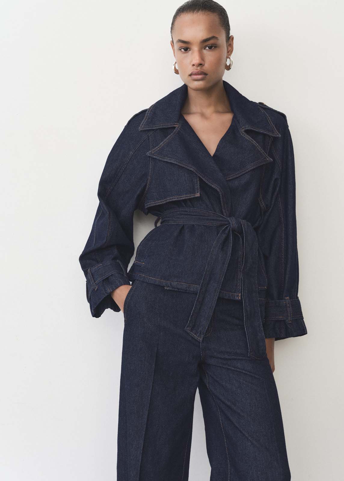 Cuello pico con solapa,Manga larga con trabillas,Cierre delantero,Trabillas en la cintura,Solapas con muesca,Diseño corto,Dos bolsillos laterales,Trabillas en los hombros,Total look,Tejido de algodón estilo tejano vaquero,Diseño oversize,Cinturón tipo batín