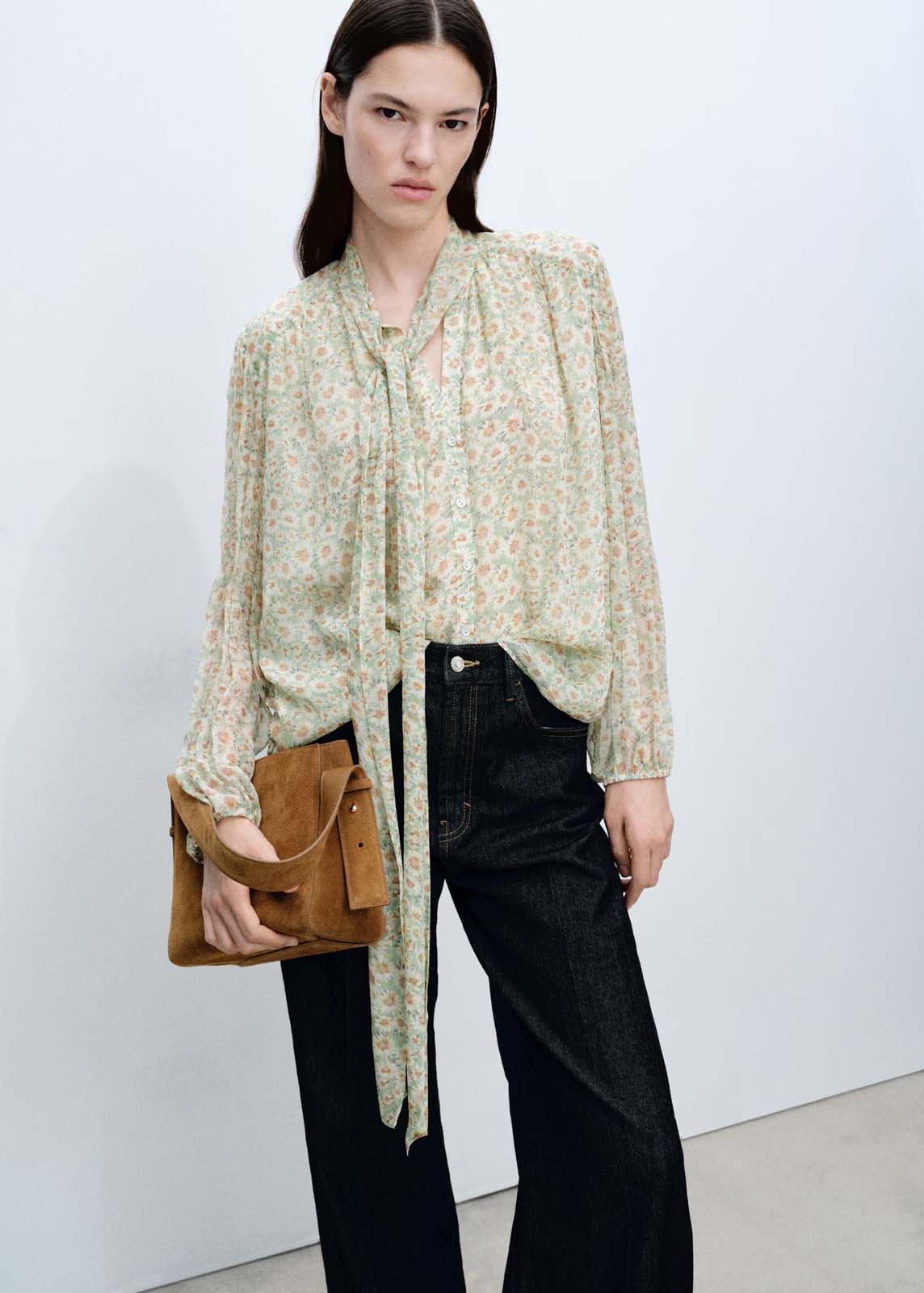 Detalle de lazo en el cuello,Tejido de gasa,Cuello pico,Cierre de botones en la parte delantera,Disponible Plus,Total look,Diseño recto,Diseño semitransparente,Estampado de flores,Forro interior,Manga larga
