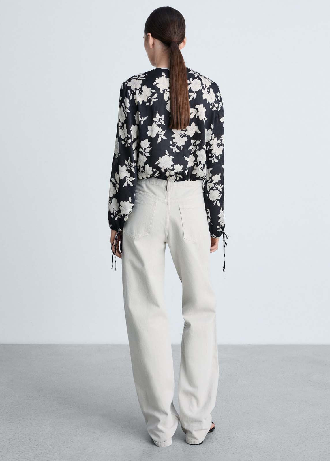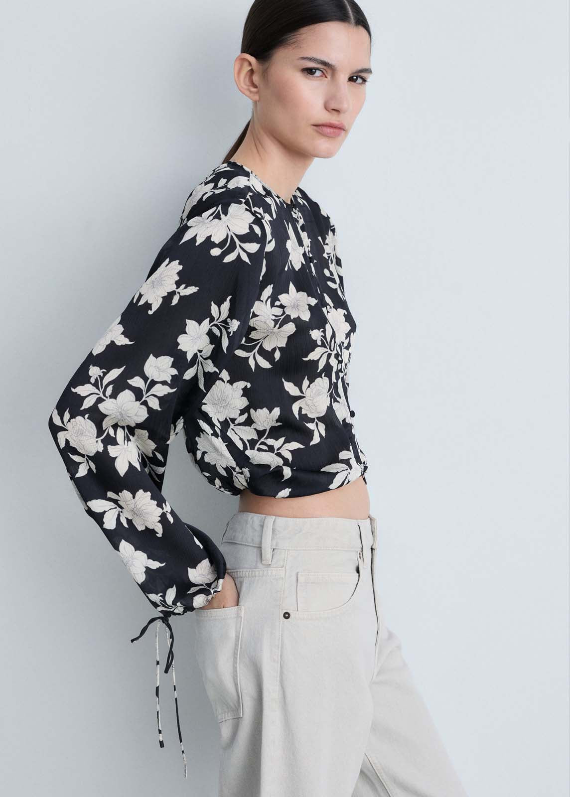 Cierre de botones en la parte delantera,Cuello redondo,Tejido satinado,Diseño recto,Estampado de flores,Manga larga con puños elásticos y fruncidos