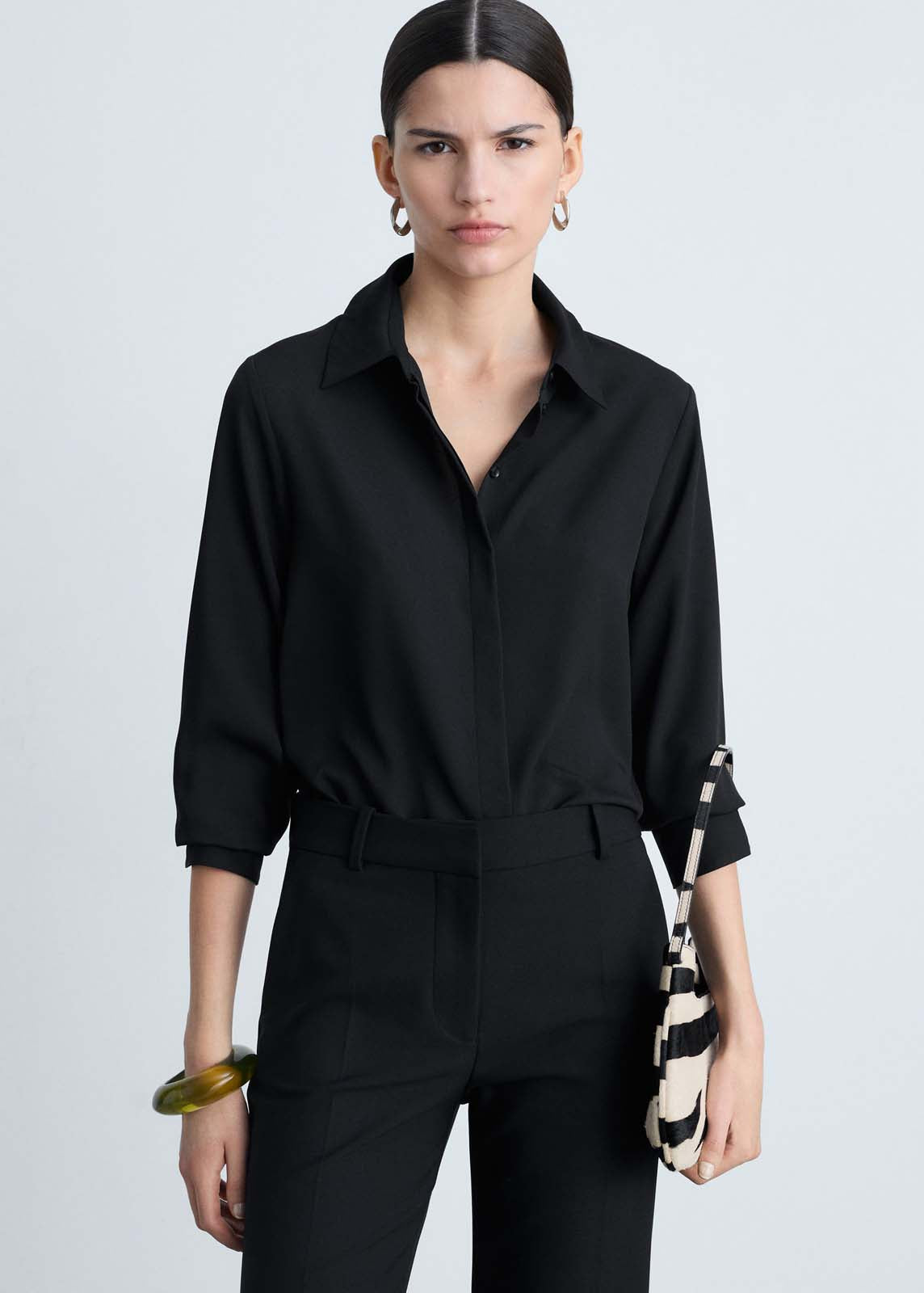 Tejido fluido,Cierre de botones en la parte delantera,Disponible Plus,Manga larga con puños abotonados,Diseño recto,Cuello camisero,Cierre delantero con botones,Manga larga abotonada