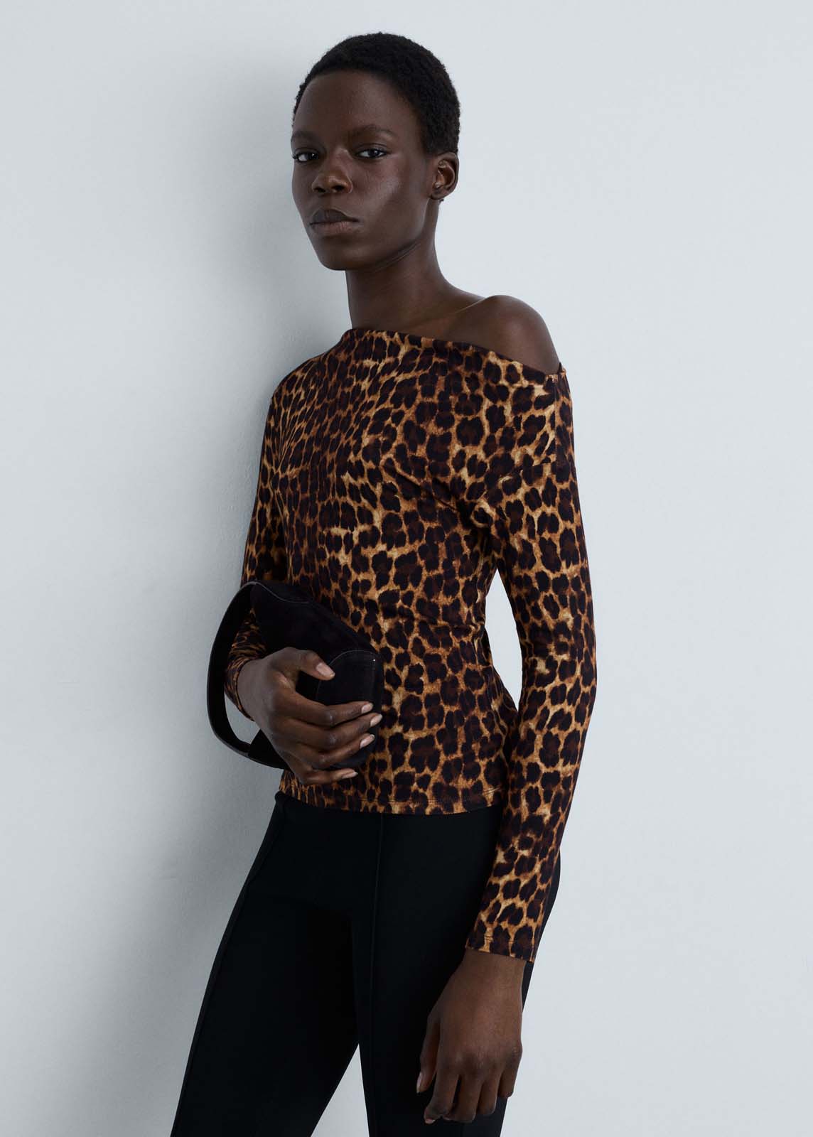 Tejido fluido,Estampado animal print,Sin cierre,Diseño recto,Estampado de leopardo,Cuello asimétrico,Manga larga