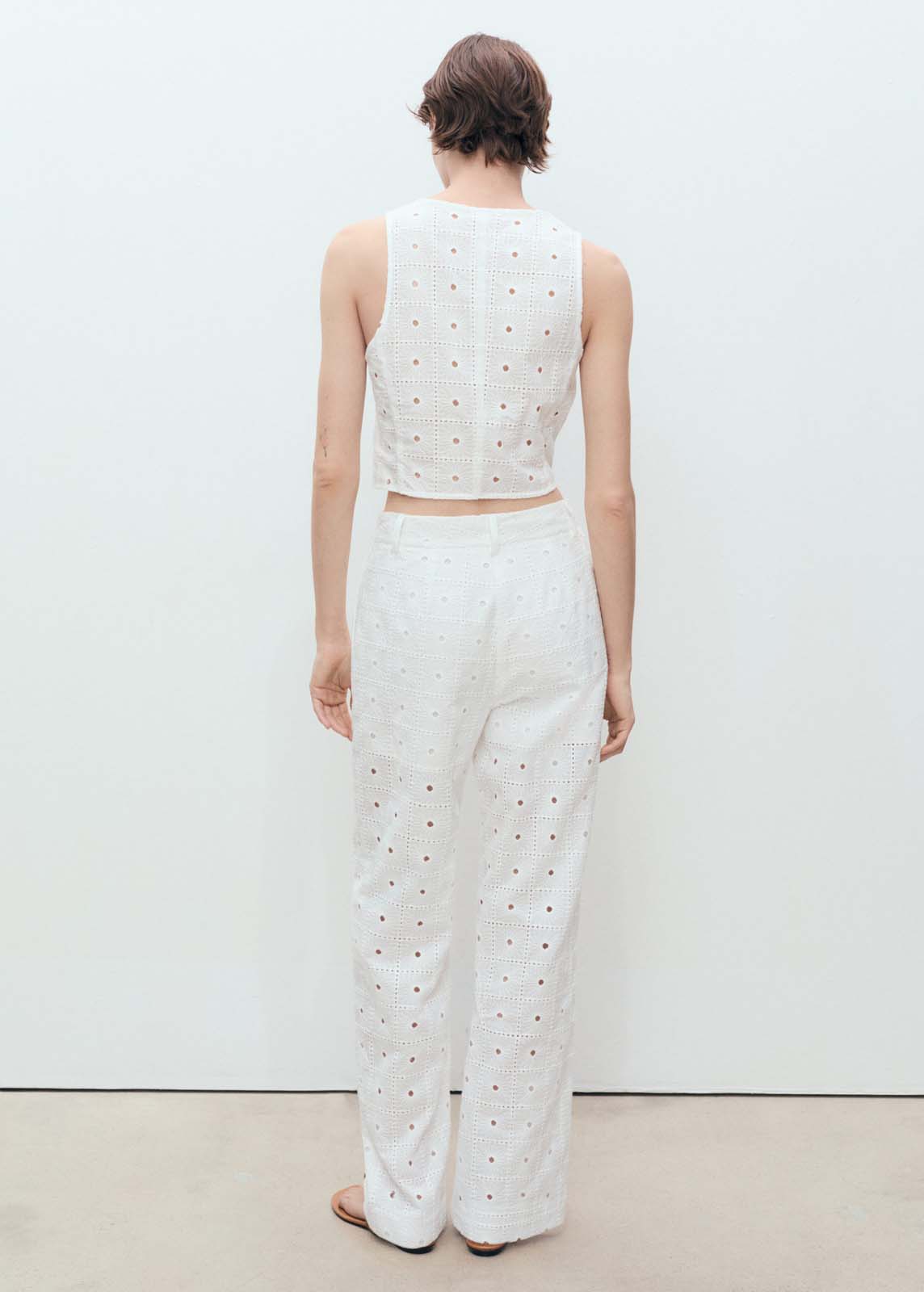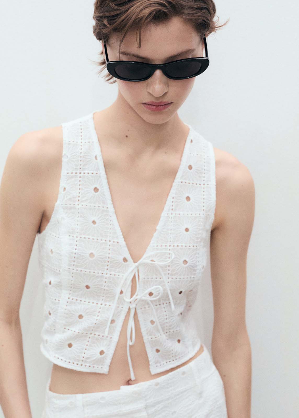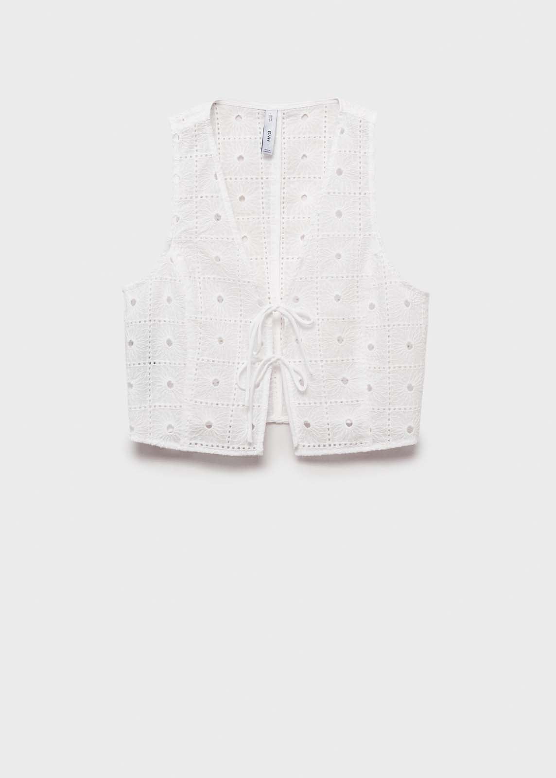 Diseño crop,Total look,Bordado floral,Diseño recto,Cuello de pico,Detalles calados,Cierre de lazos en la parte delantera,Sin mangas,Tejido de algodón