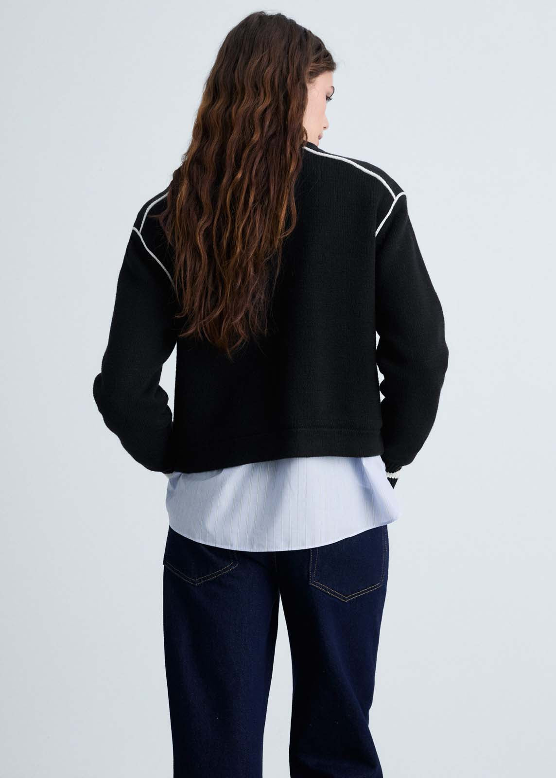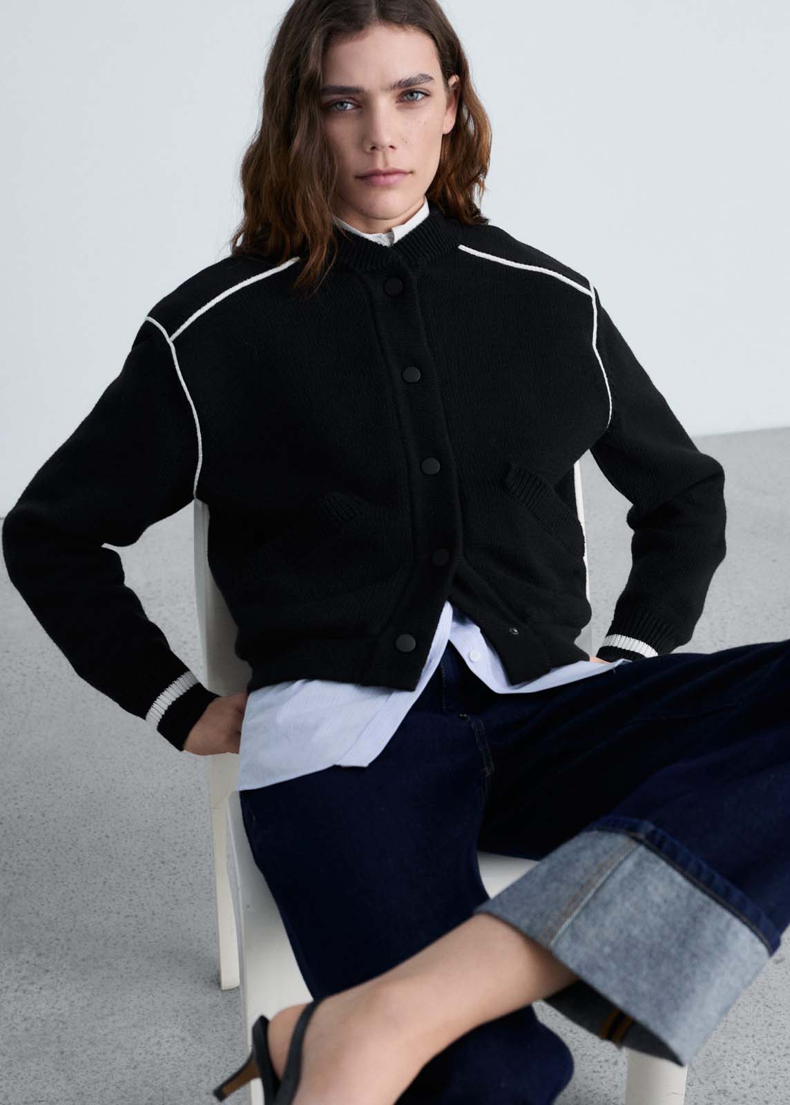 Detalle de rayas en contraste,Cierre de botones en la parte delantera,Cuello redondo,Diseño recto,Tejido de punto,Manga larga,Estilo bomber