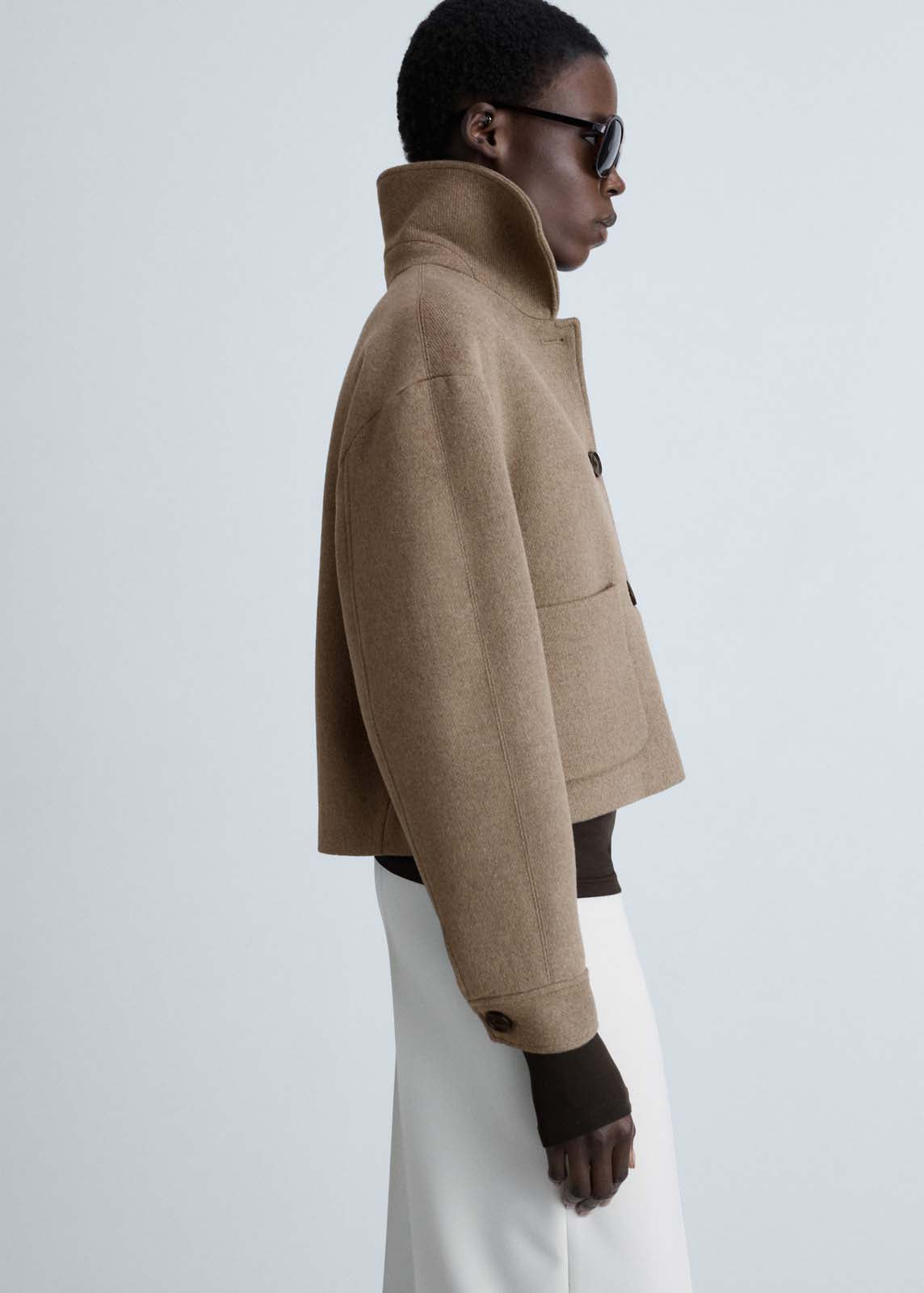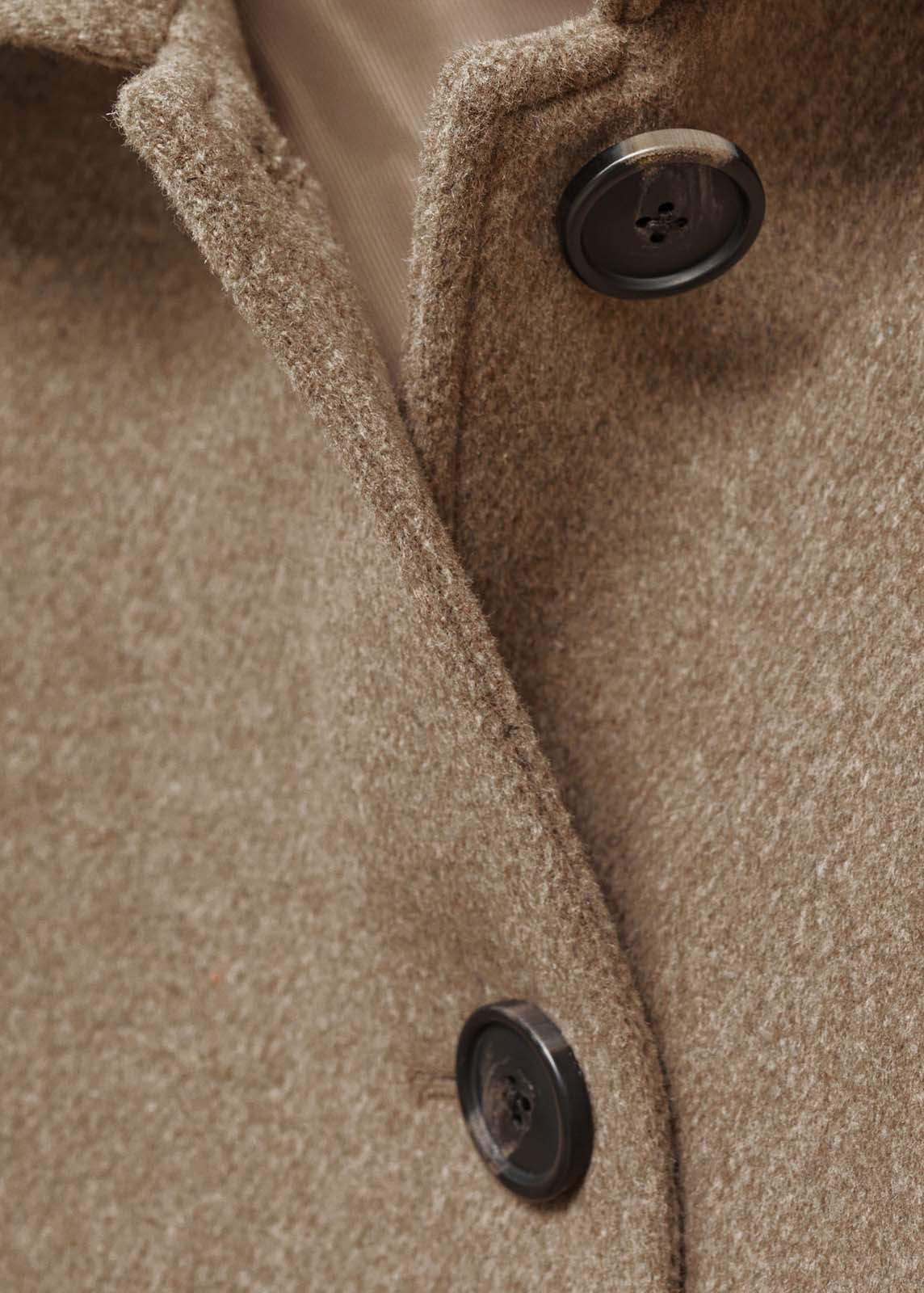 Puños con botones funcionales,Tejido mezcla de lana,Cuello de solapa,Dos bolsillos de parche en la parte delantera,Cierre de botones en la parte delantera,Diseño corto,Diseño recto,Forro interior,Manga larga