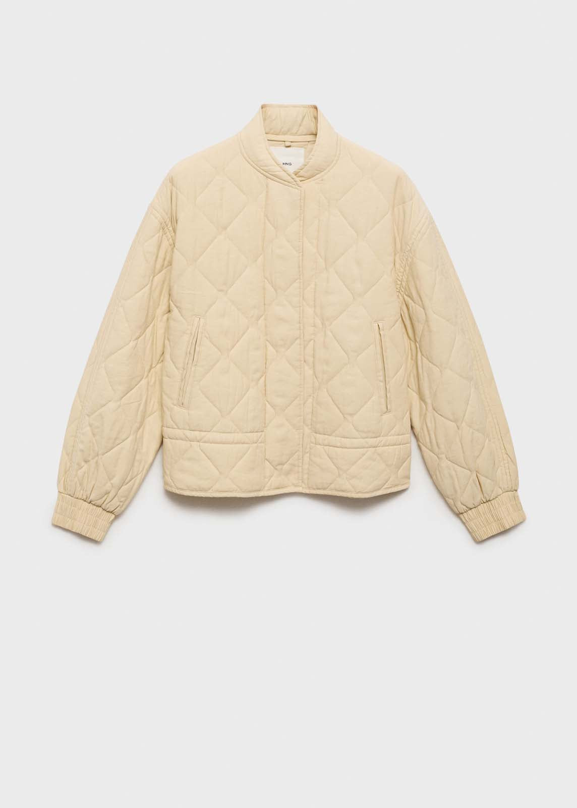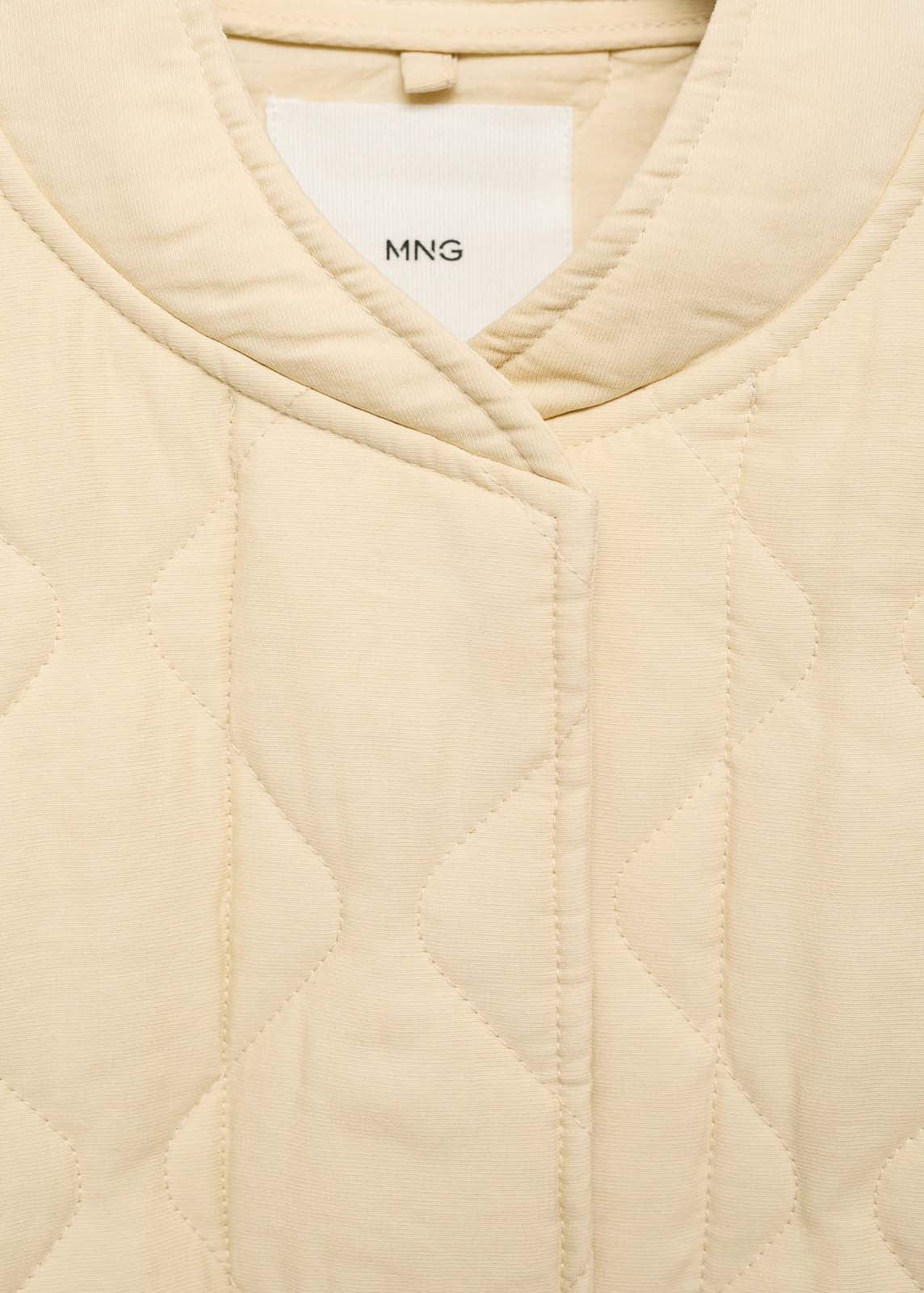 Dos bolsillos de ribete laterales,Diseño acolchado,Detalle fruncido en el bajo,Cuello perkins,Cierre delantero con botones,Forro interior,Manga larga,Estilo bomber