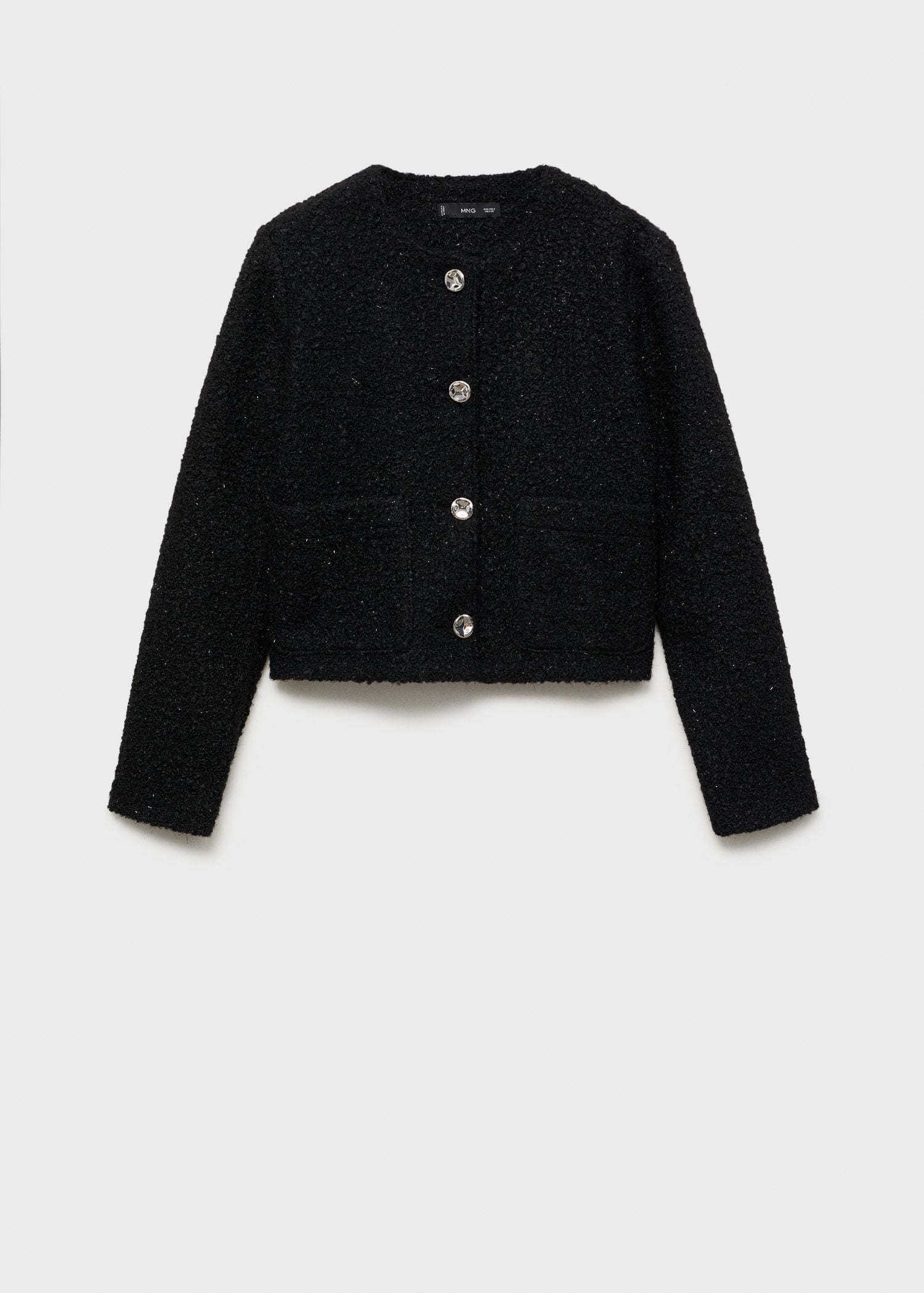 Botones efecto joya,Cierre de botones en la parte delantera,Cuello redondo,Diseño recto,Tejido bouclé,Dos bolsillos de parche frontales,Forro interior,Manga larga,Detalle brillante en el tejido