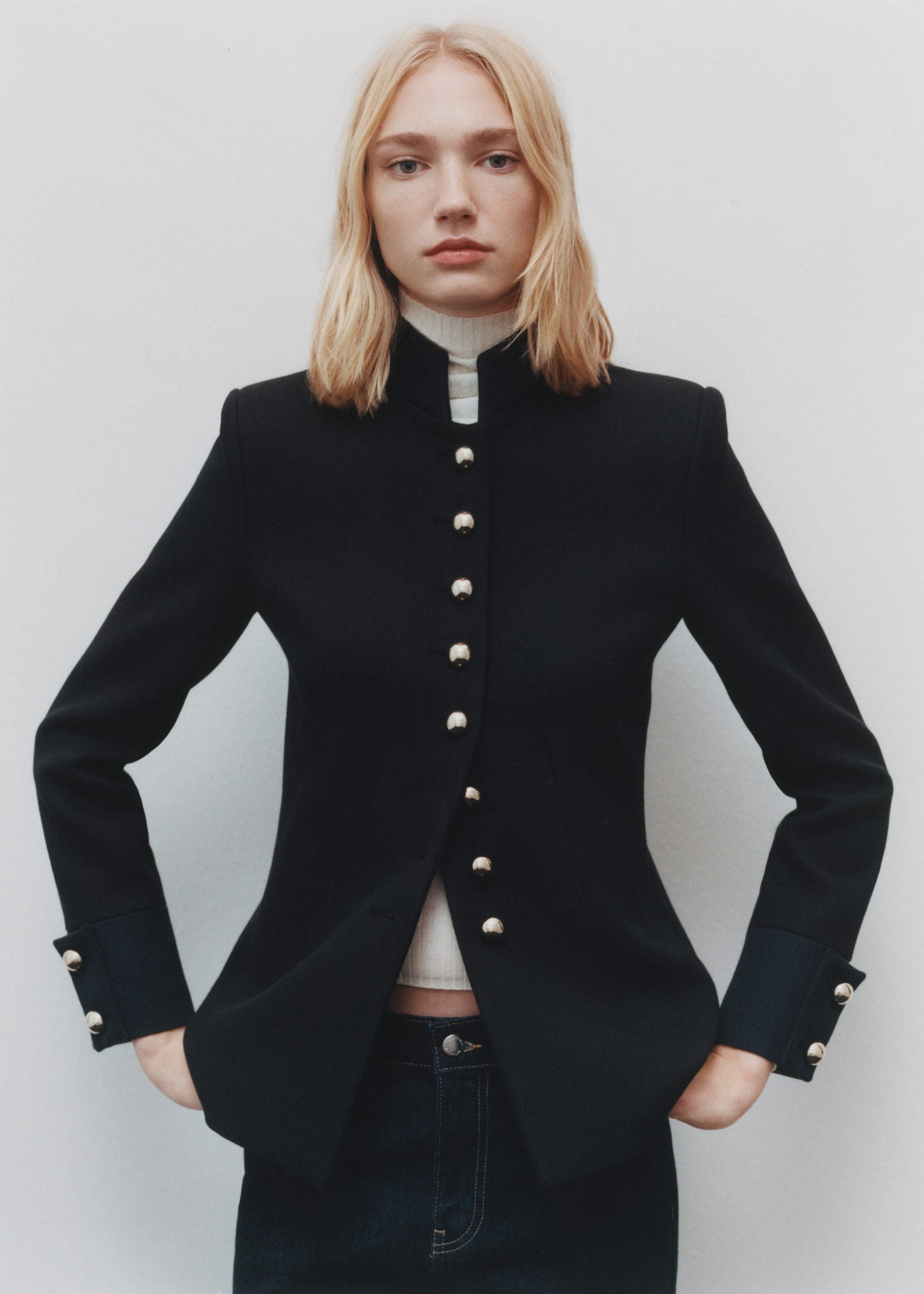 Botones efecto joya,Cuello de tira,Diseño recto,Diseño estructurado,Tejido mezcla de algodón,Cierre delantero con botones,Forro interior,Manga larga