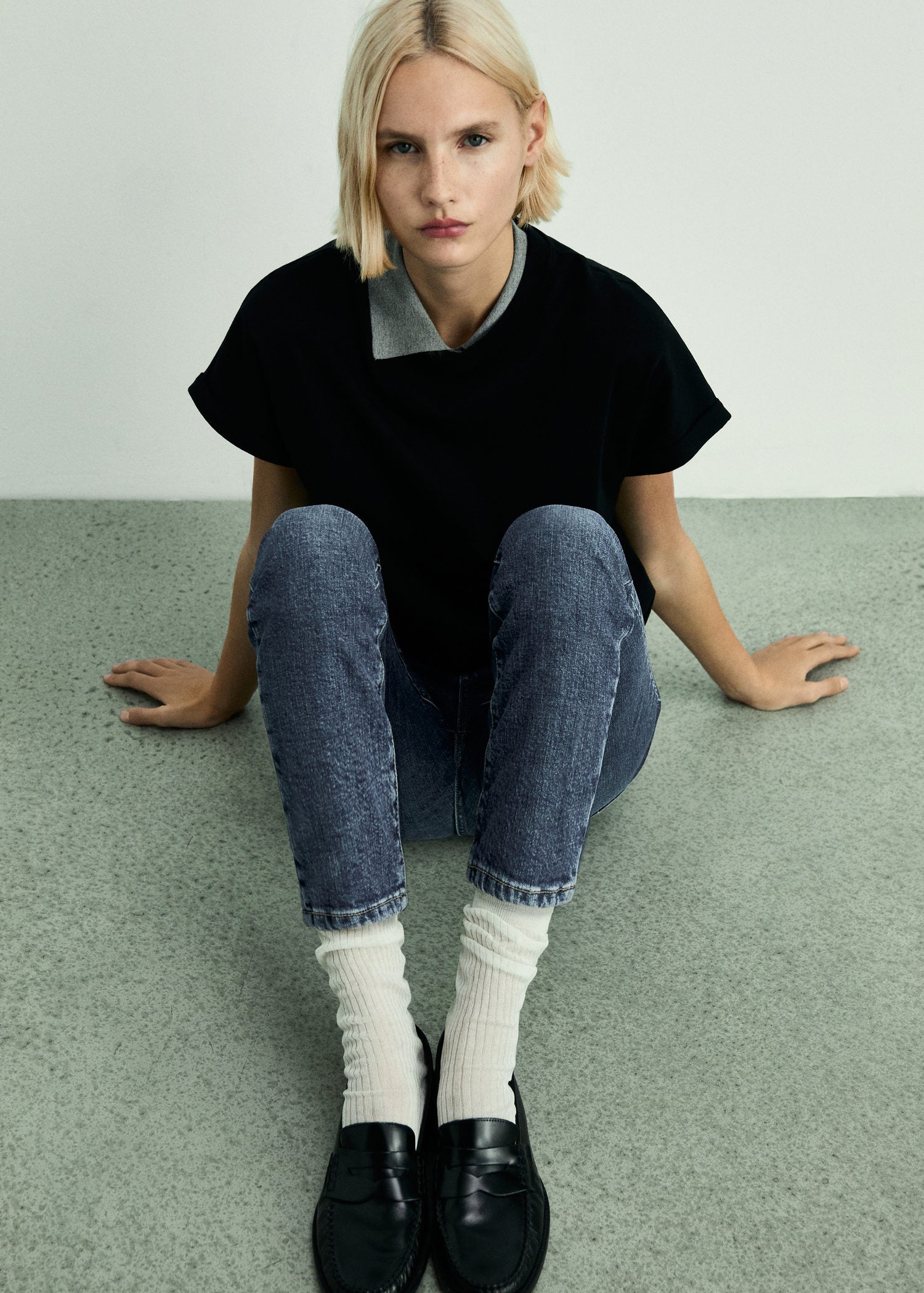 Trabillas,Cierre delantero de cremallera y botón,Diseño crop,Cinco bolsillos,Slim fit,Disponible Plus,Largo interior 68 cm,Tejido elástico,Tejido de algodón estilo tejano vaquero,La modelo mide 1,79 y lleva una talla S/36,Tiro alto