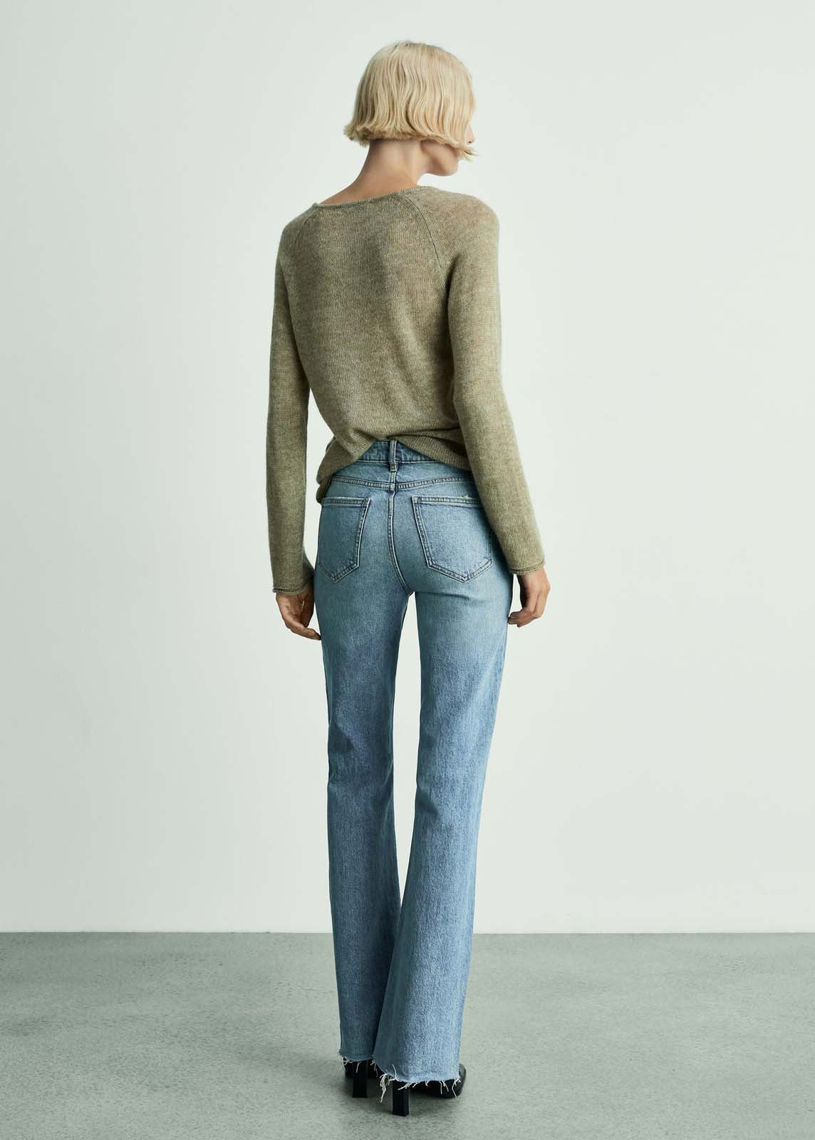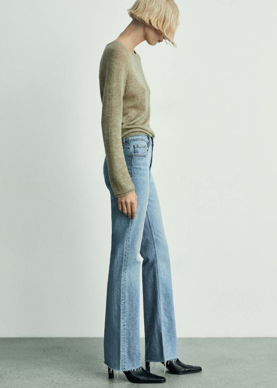 Cierre de cremallera y botón,Trabillas,Tiro medio,Largo interior 83 cm,Cinco bolsillos,Disponible Plus,Diseño campana,Bajo deshilachado,Estilo flare,Tejido de algodón estilo tejano vaquero,Full length