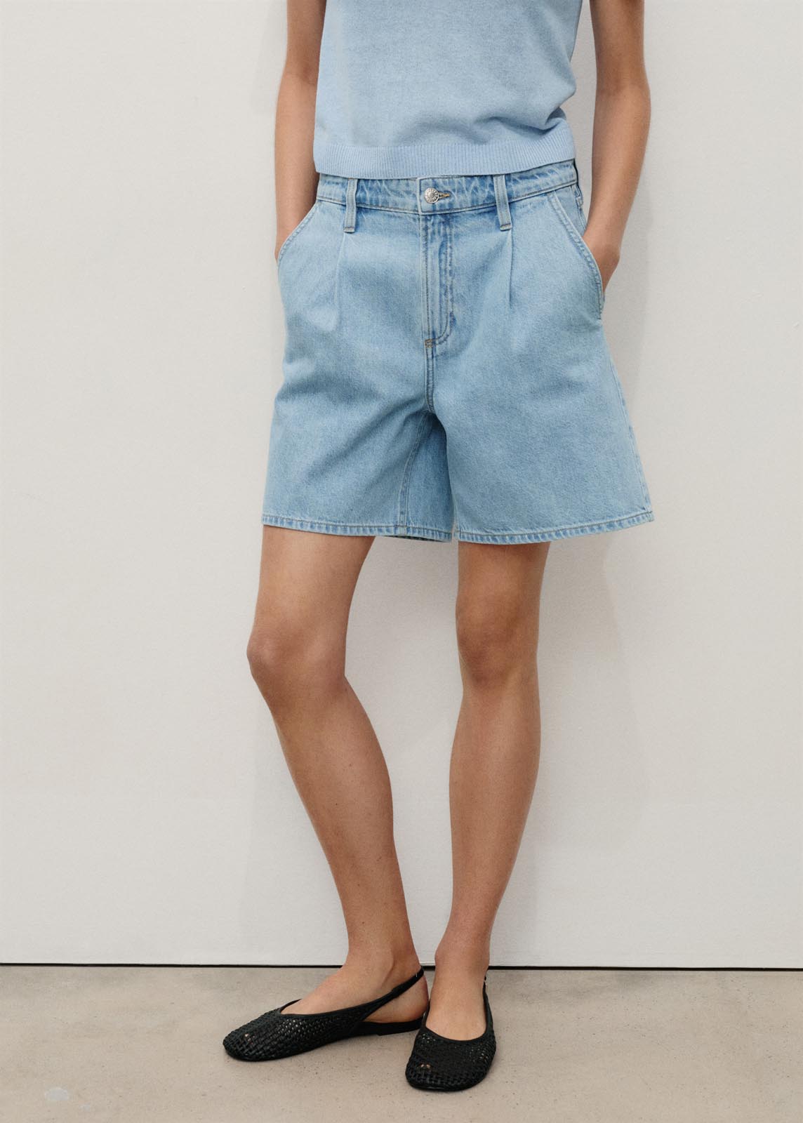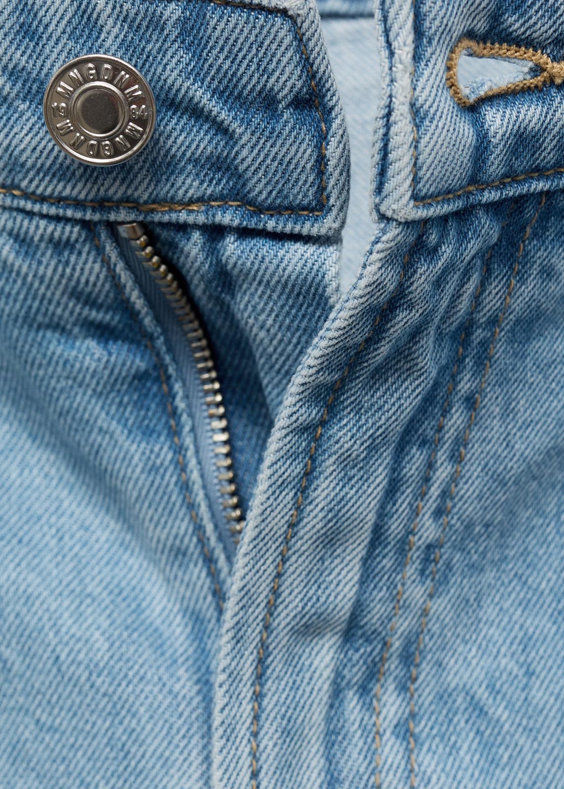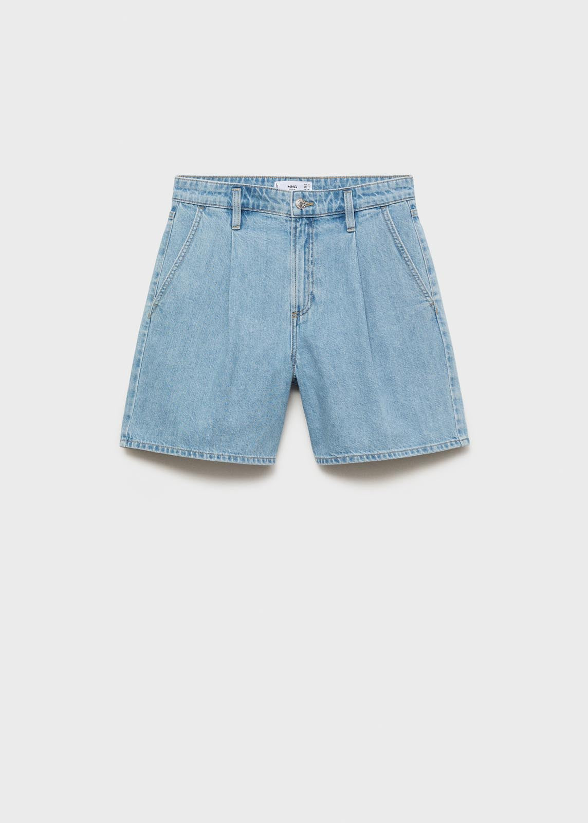 Cierre de botón y cremallera,Trabillas,Dos bolsillos en la parte posterior,Tiro medio,Detalle de pinzas,Diseño corto,Dos bolsillos laterales,Diseño recto,Tejido de algodón estilo tejano vaquero