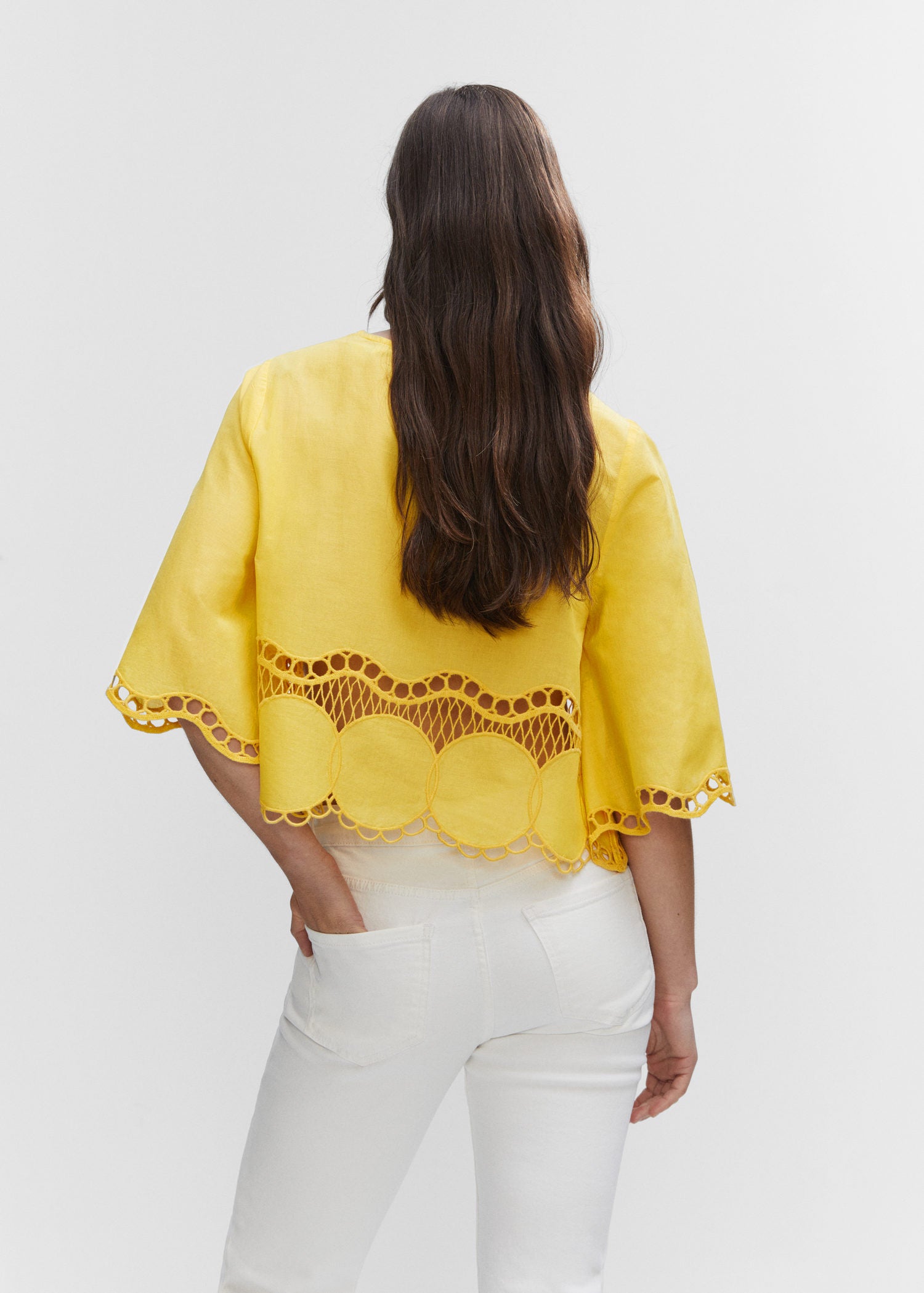 • Blusa oversize bordada- Cuello redondo,Diseño crop,Diseño oversize,Abertura en la espalda con cierre de botón,Manga corta acampanada,Terminaciones bordadas,Tejido 100% algodón- No usar lejia, Plancha max 110°c, Lavar a maquina max 30°c centrifugado corto, No limpiar en seco, No se puede usar secadora- COMPOSICIÓN: 100% ALGODÓN BORDADO: 100% POLIÉSTER - 282mm x 496mm-