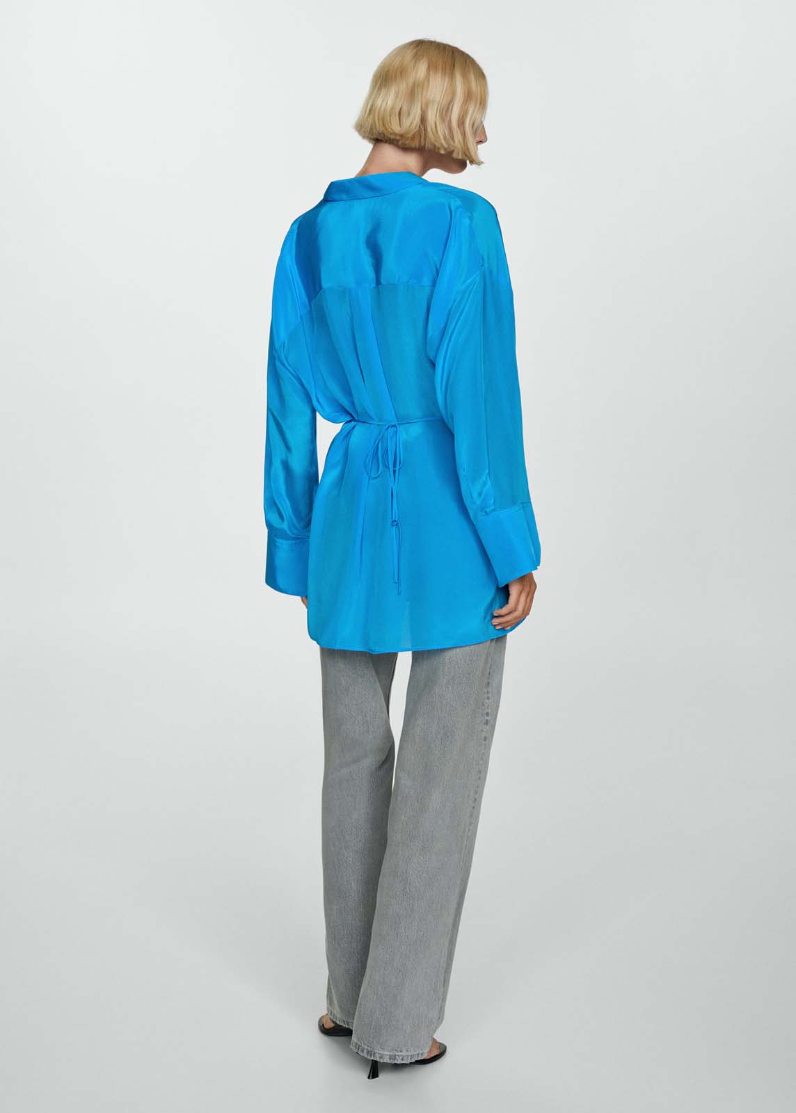 Tejido fluido,Cierre de botones en la parte delantera,Tejido satinado,Cierre asimétrico de botones,Manga larga con puños abotonados,Diseño ajustable,Diseño recto,Cuerda ajustable en la parte posterior,Cuello camisero,Diseño largo