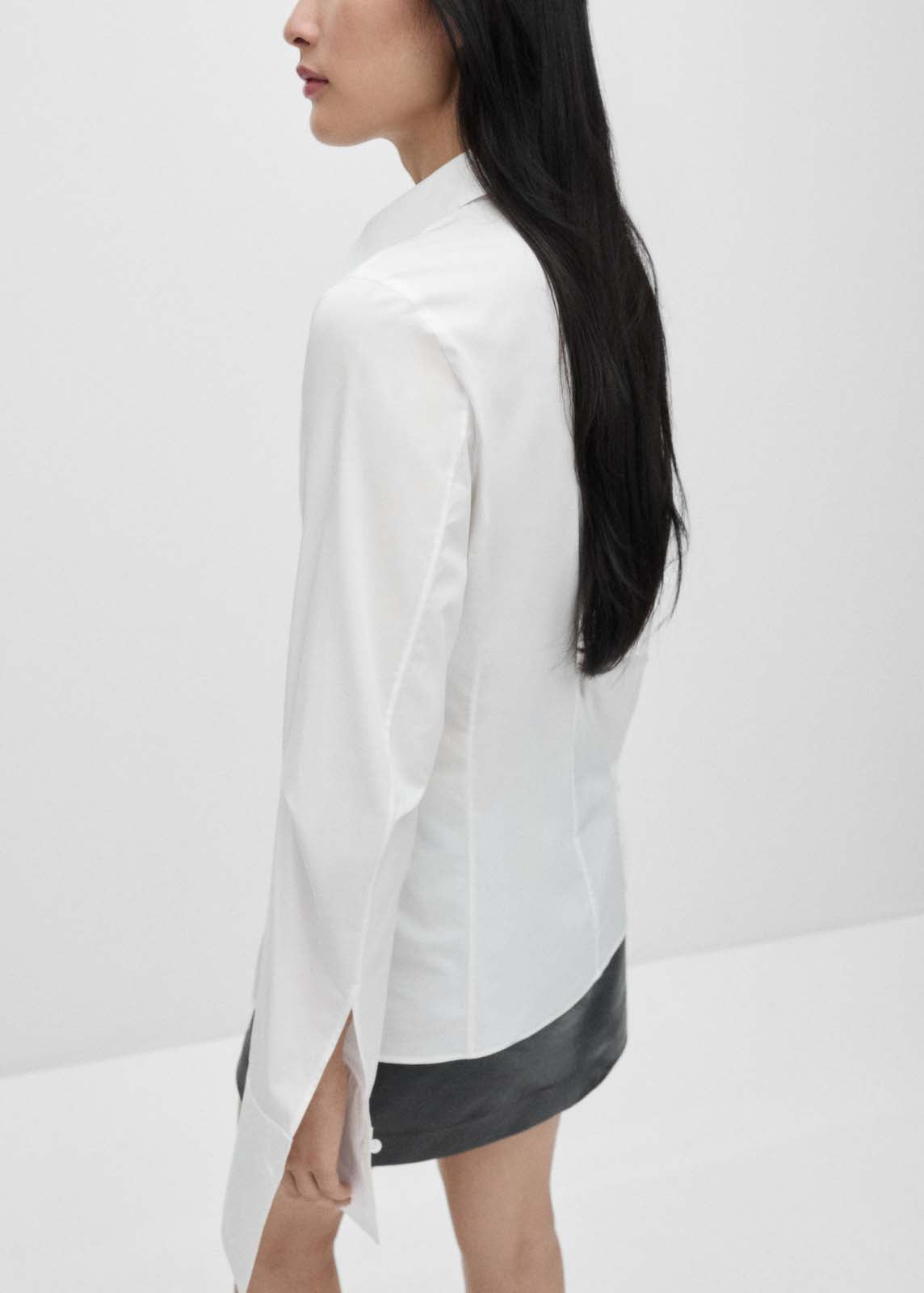 Detalle de pliegues en las mangas,Manga larga con puños abotonados,Diseño recto,Cuello camisero,Tejido 100% algodón,Cierre delantero con botones,Colección Selection,La modelo mide 1,75 y lleva una talla S/36