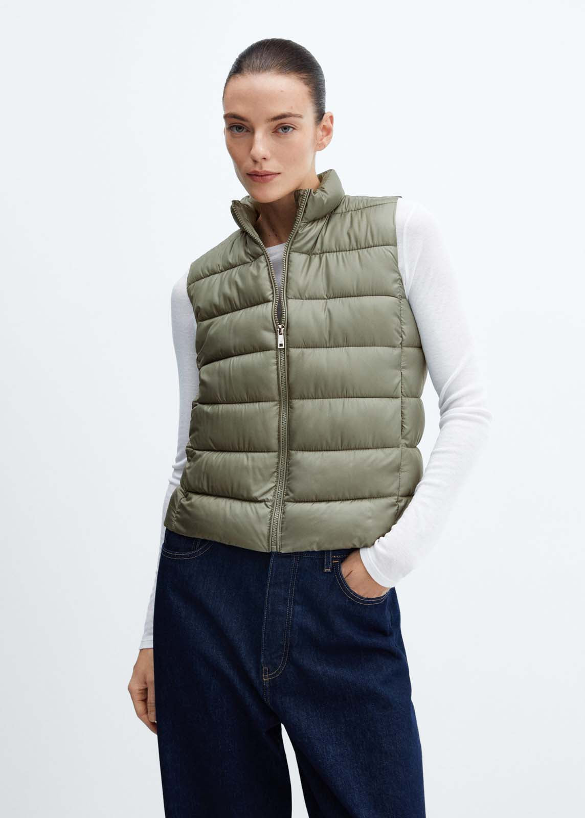 Cuello alto,Diseño recto,Cierre de cremallera en la parte delantera,Sin mangas,Forro interior,Tejido acolchado,Dos bolsillos laterales con botón a presión,Water Repellent: Tejido técnico repelente al agua,Disponible Plus,El color blanco es exclusivo online