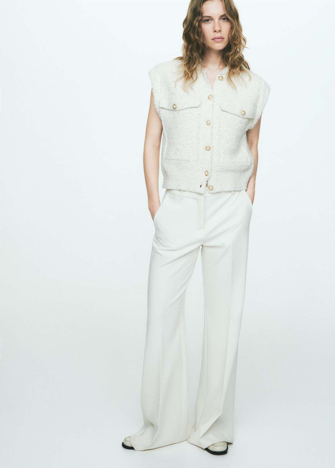 La modelo mide 180 cm y lleva una talla S,Cuello redondo,Diseño recto,Cierre de botones,Tejido con lentejuelas,Sin mangas,Tejido mezcla de algodón,Dos bolsillos de solapa en la parte delantera,Punto medio