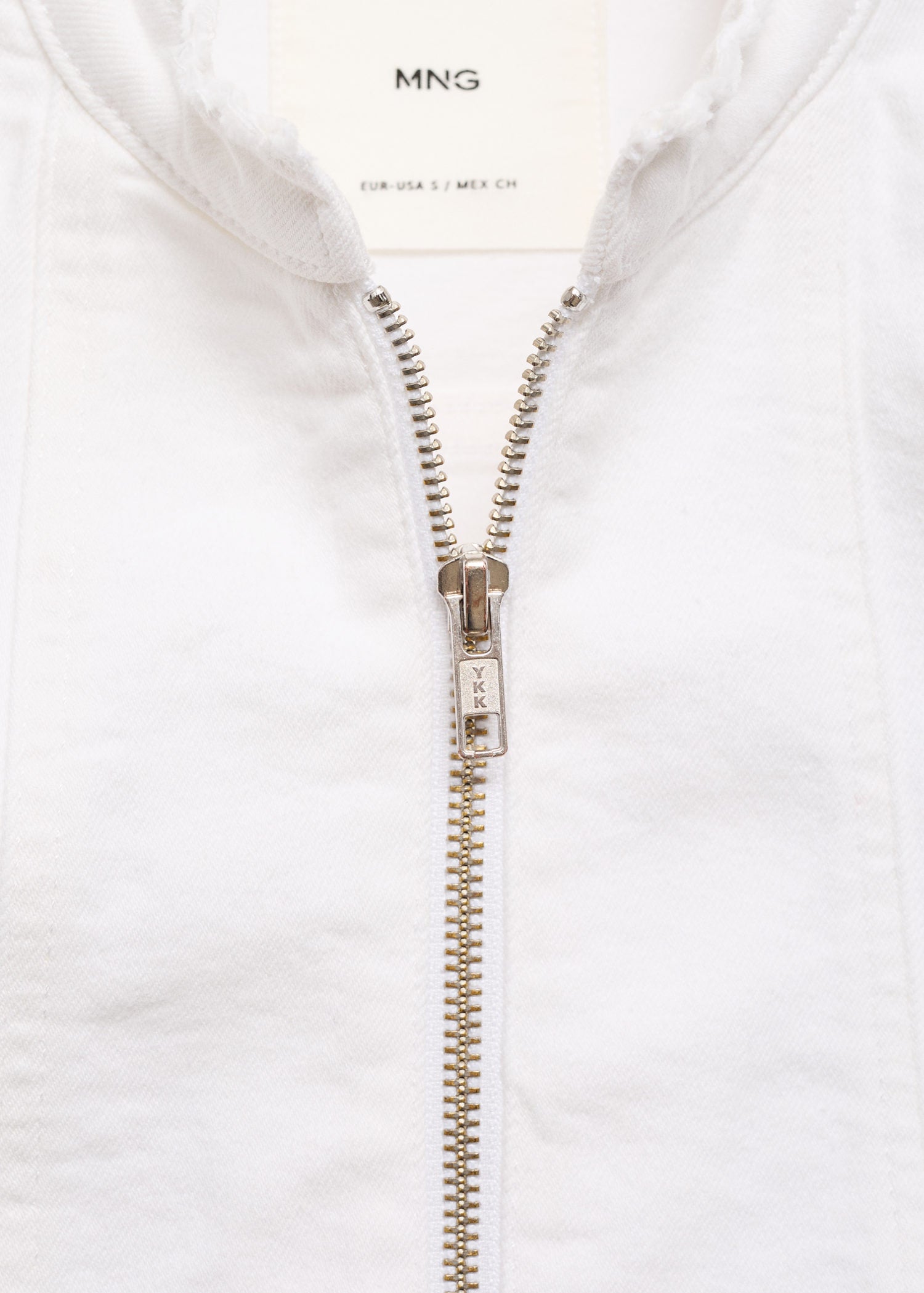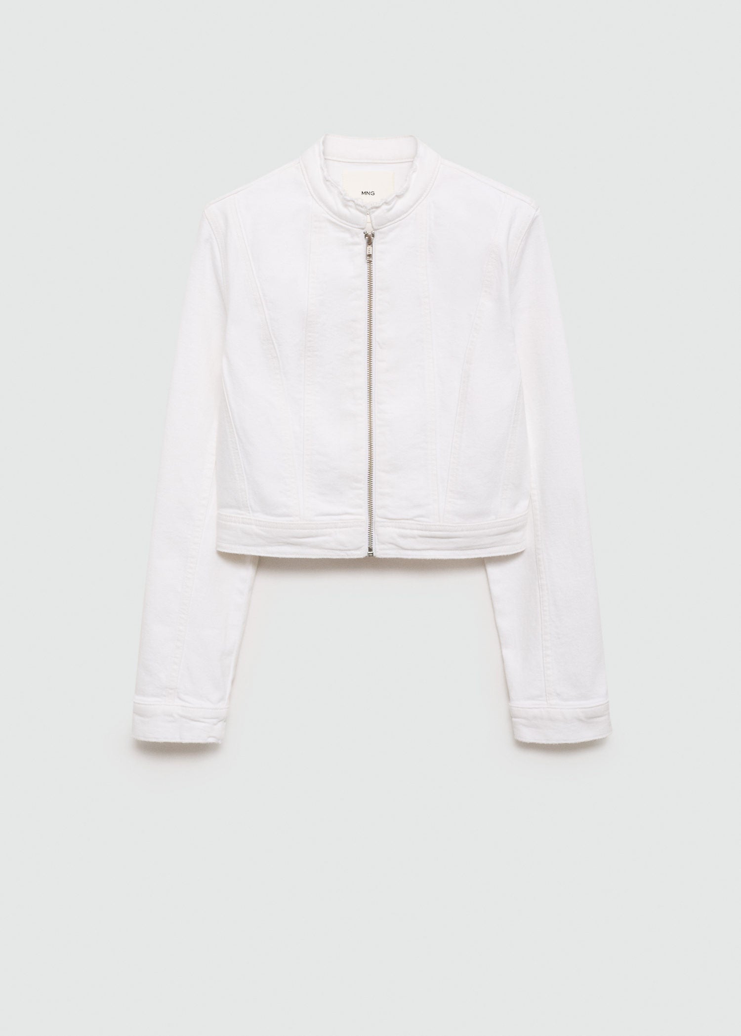 Cierre delantero con cremallera,Cuello mao,Tejido de algodón estilo tejano vaquero,Diseño biker,Diseño entallado,Manga larga